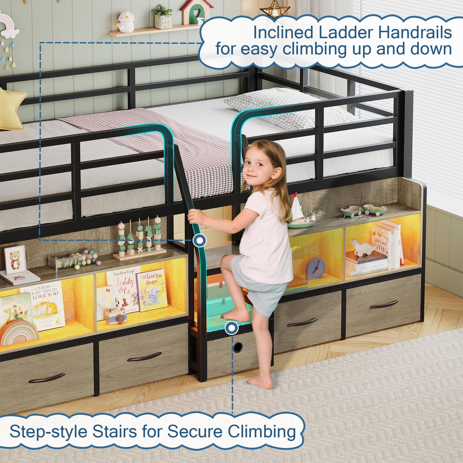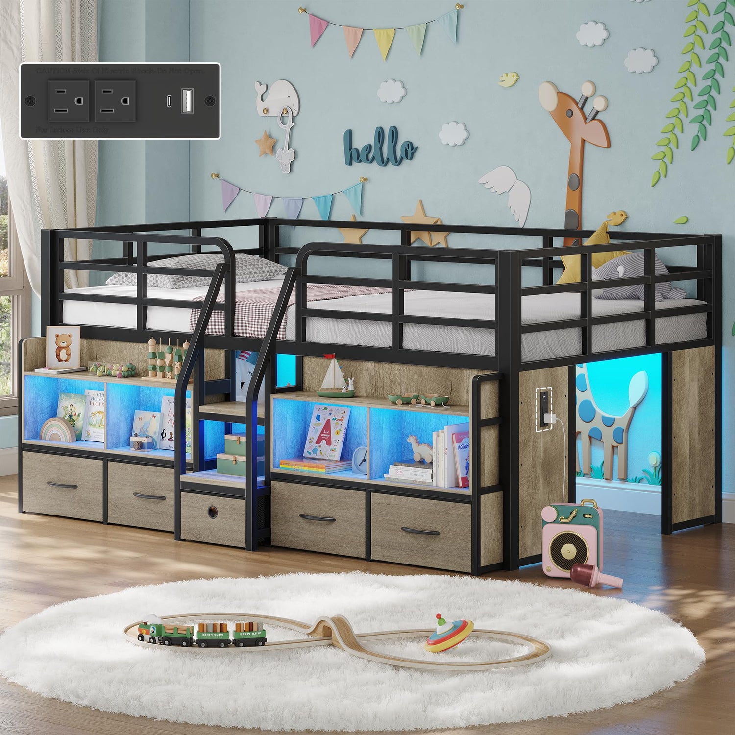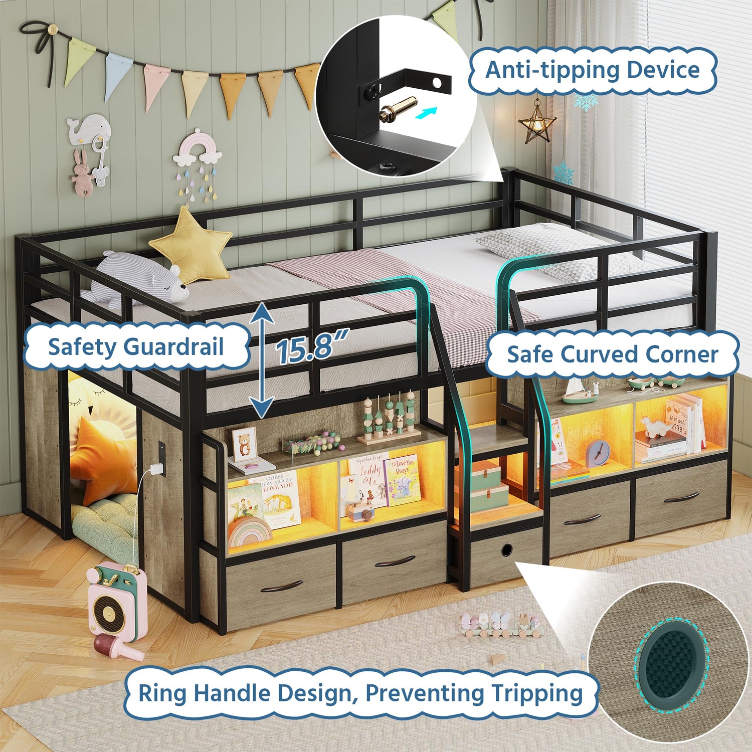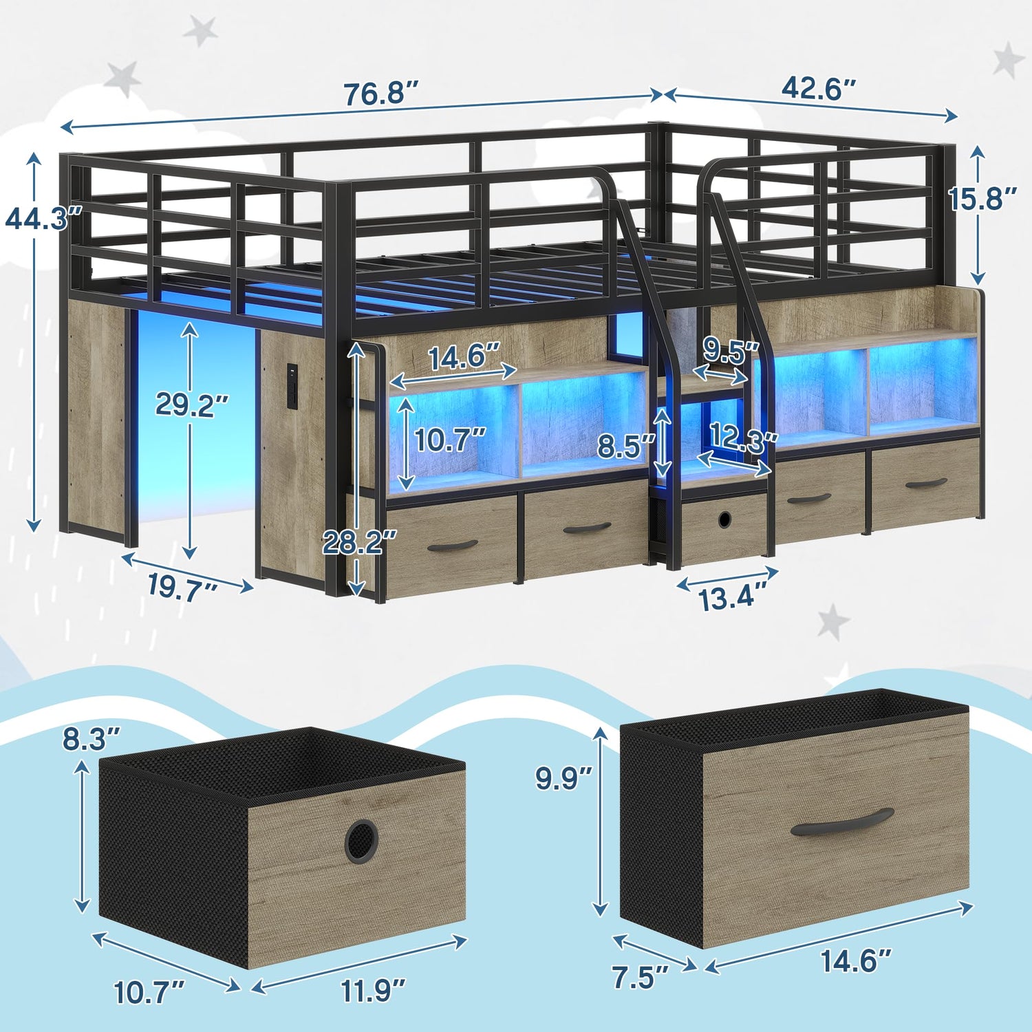 BYSAUD Twin Loft Bed, Low Loft Bed Twin with 5 Drawers, 6 Storage Bookcase & Under-Bed Play Space, Loft Beds for Kids with LED Lights & Charging Station, 15.8" H Safety Guardrails, Oak Gray