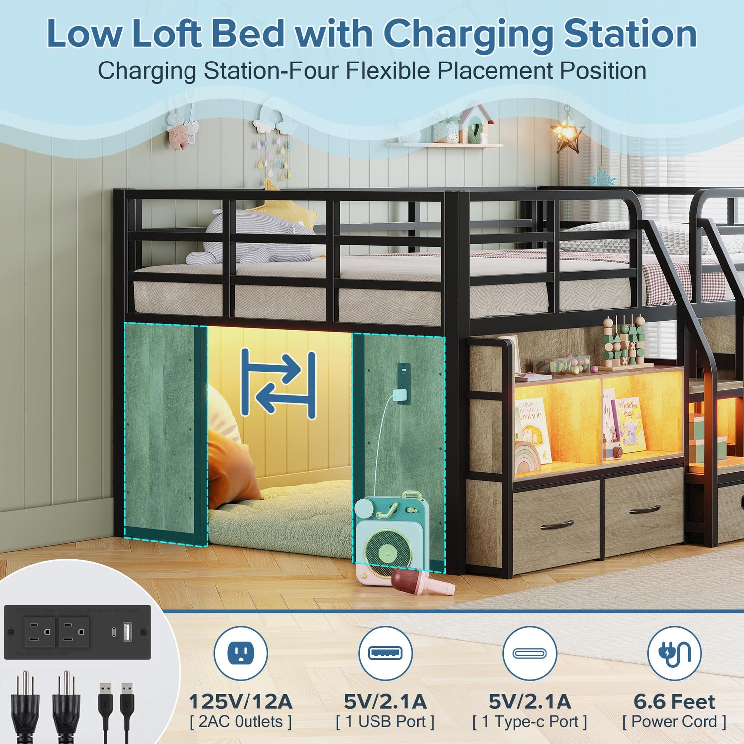 - 【Kids Loft Bed with Charging Station】The Twin Bed Frames for Kids is equipped with the charging station that includes 2 sockets and 1 USB port and 1 Type-C port for easy charging of your phone, electric toys, computer or gaming device.The four doors under the Twin Low Loft Bed can be flexibly positioned. You can place the door with the charging station in the suitable location based on your room layout.