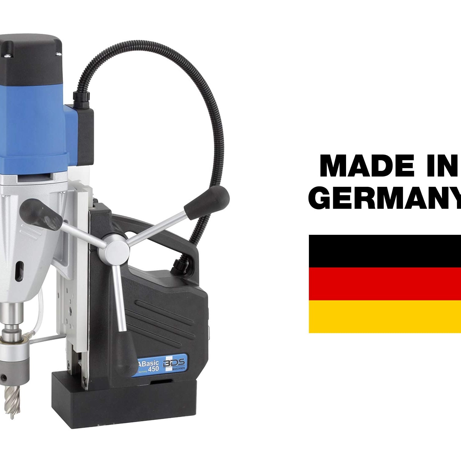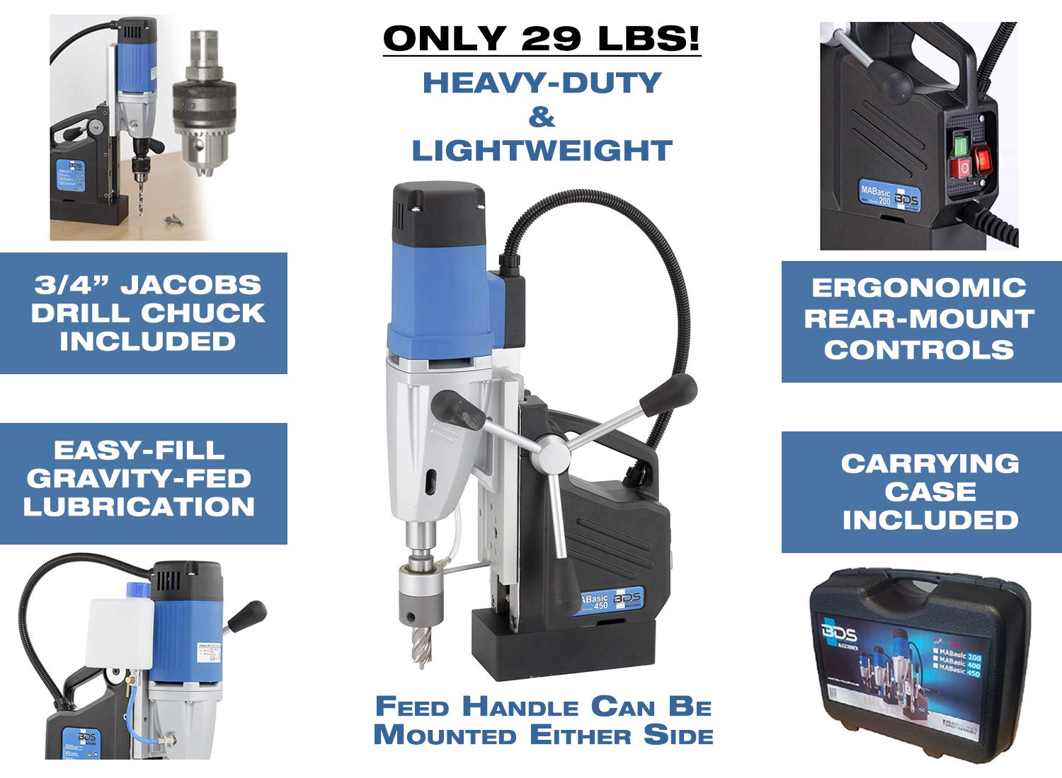 Details: MA Basic 450 magnetic drill press is a powerful. Reliable and economical single-speed portable magnetic drill designed for demanding fabrication and continuous use pact, Lightweight and Manoeuvrable: -The MA Basic 450 mag drill cuts holes up to 1-5/8" dia. with annular cutters, up to 5/8" with twist drill bits (1/2" Jacobs drill chuck included). -MT2 adapter allows for easy, fast change out of tool holders to fit almost any style cutting tool from annular cutters, twist drill bits, reamers, countersinks and more. -29 lbs and 1150W of power-Handles can be swapped to either side, handles are fully removable for drilling in compact spaces, verticals and overhead. -Overall height 17", magnet footprint 6. 6" by 3. 3"-2 Speed Gearbox with 250/450 rpm load speed rpm-Through spindle integrated coolant delivery, extends cutter life and increases drill press cutting speed-Easy Guide adjustment Electronic Safety Shut-off: Automatically shuts down the drill motor if the magnet loses contact with the material. This emergency-off feature helps protect both the operator and equipment. Full Specifications: -10. 5 Amp/110 Volt Motor, 29 lbs, 1-3/4” diameter hole capacity, 3/4” Twist Drill capacity, 2 Speed 250/450 RPM, 6. 6” L x 3. 3" Magnetic Base, 17” H x 9”L x 6-1/2” W, 3080 lbs magnetic force, Morse Taper 2 (MT2), ¾” Weldon Shank. Included Equipment: (1)Carrying case, (1) 3/4" Jacobs drill chuck (p/n IBC 22), (1) 3/4" weldon shank tool holder (affixed), (1) gravity feed lubrication system and removable reservoir, (1) safety strap carabin hook, (2) allen keys, (1) 1" pilot pin, (1) 2" pilot pin. Click on the CS Unitec links to see our quality annular cutters and our full selection of magnetic drill presses.