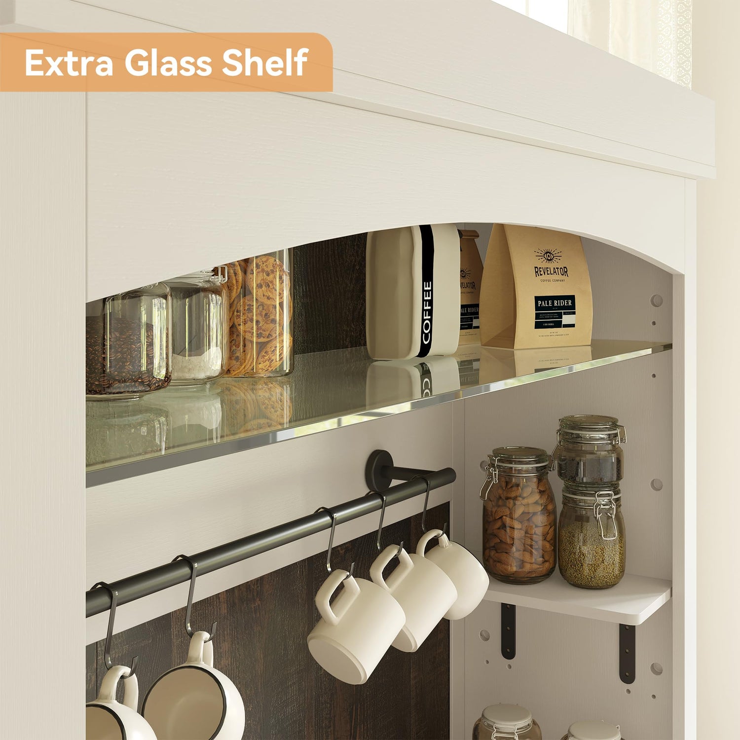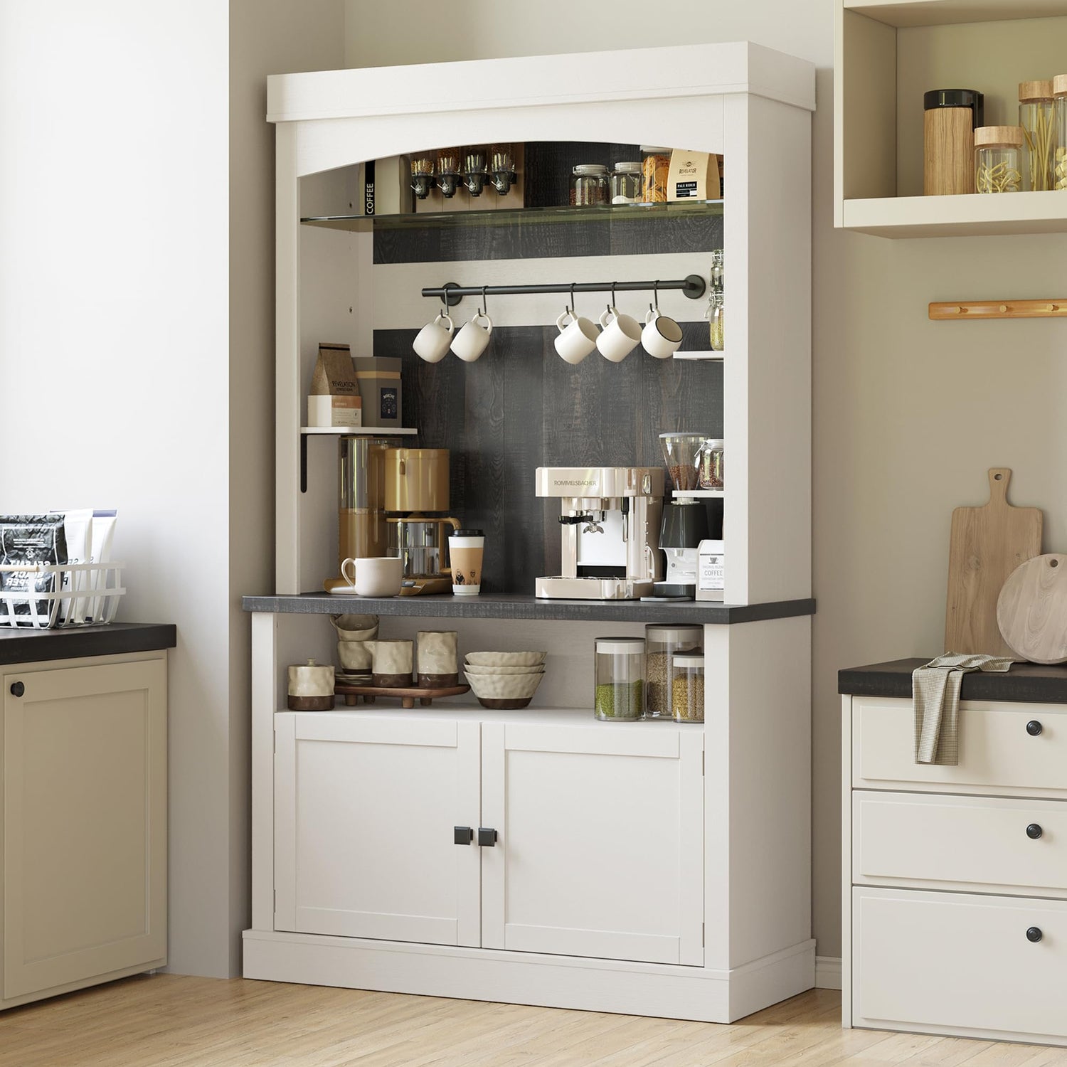 - Plentiful Storage With Cabinet: This farmhouse kitchen cabinet combines a buffet and an upper hutch with a top glass shelf and three side shelves to provide ample storage and accessibility, the 42" wide spacious countertop is ideal for accommodating appliances like a microwave, or coffee maker, or showcasing a collection of decorative items. Equipped with a cabinet and hanging rod, this coffee hutch caters to diverse storage needs, allowing you to organize knives, forks, bowls, stir sticks and other tableware efficiently. With its stylish design and practical functionality, this buffet cabinet serves as a versatile addition to your space.