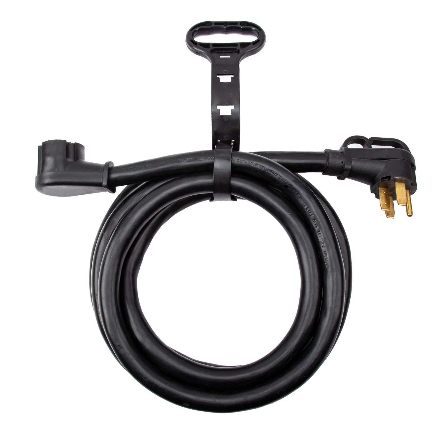 The Cable Matters 50A RV Extension Cord provides the extra length need to connect your RV in a campground with a 50A power pedestal. Power your A/C and other appliances with confidence. The easy-grip handles makes disconnecting from the campsite power easier and safer. A convenient carry strap is included for storing and transporting the cord.