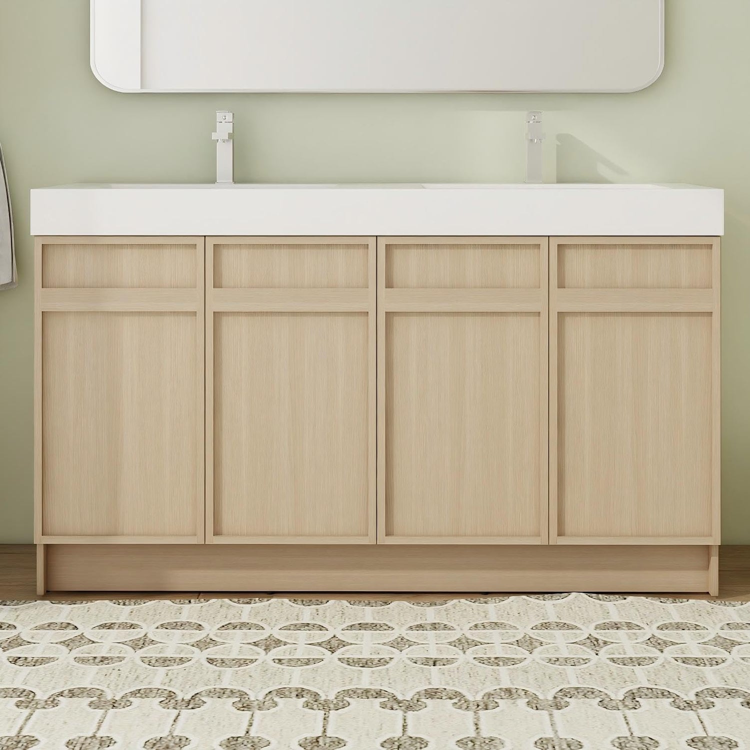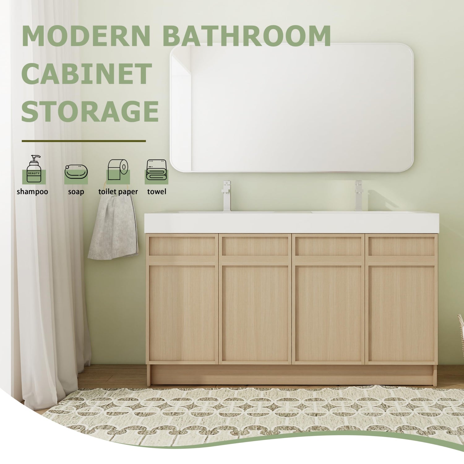 - STURDY AND ECO: The 60 Inch Freestanding Vanity is constructed from premium eco-friendly PLYWOOD and finished with scratch and water-resistant melamine. It is designed to endure moisture and humidity while being easy to clean and maintain.