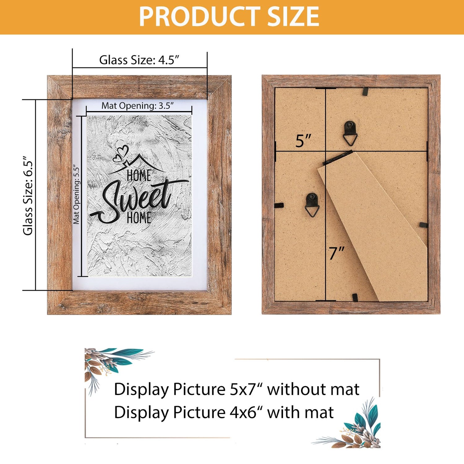 - Beveled Mat: This 5x7 frame fits an 4x6 picture with the mat, or 5x7 picture/photo/print without the mat. The mat opening is designed to be 0.5 inches smaller than the photo itself (4.5"x6.5") in order to securely hold it in place