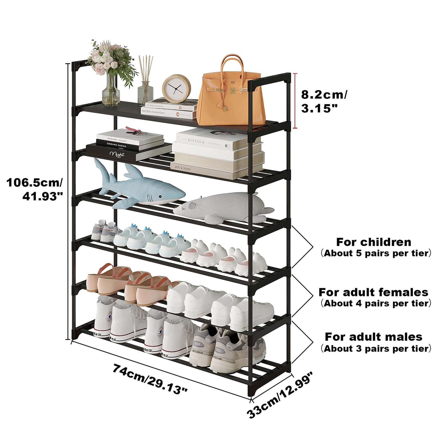 - [Practical & Stable] Each shelf can hold 3 pairs of adult male shoes, or 4 pairs of adult female shoes, or even 5 to 6 pairs of children's shoes. The non-woven top shelf can hold lightweight items such as handbags, umbrellas or dolls. Fully meet the daily needs of a family.