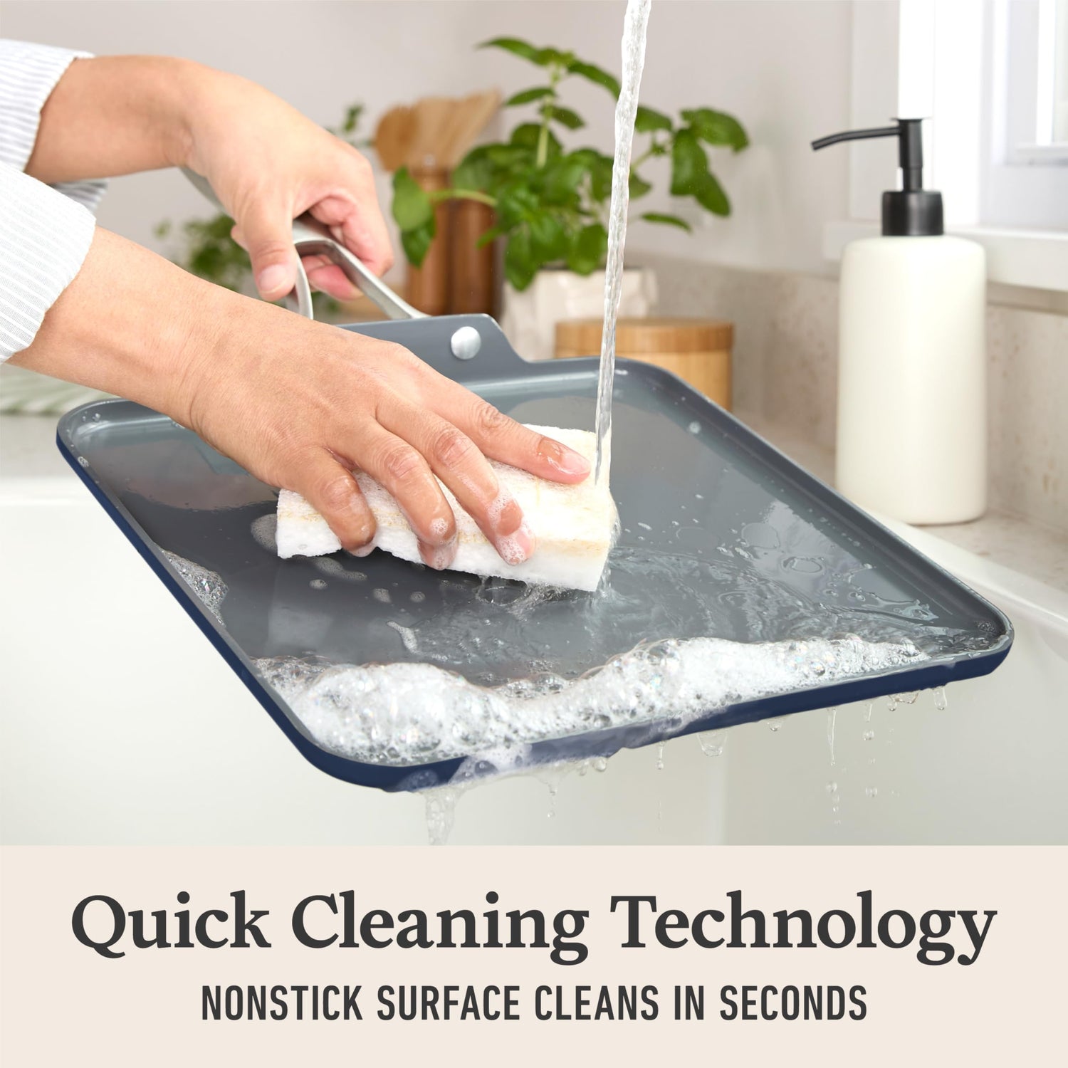 Details: Make every meal a masterpiece with the Calphalon® Premier Ceramic Nonstick Square Griddle. Meticulously designed with robust construction and style, this griddle pan set is a standout addition to any cookware collection. Embrace pans that look brand new after every use with our Quick Clean Technology, making clean up effortless. Say goodbye to tedious scrubbing and say hello to long-lasting performance. Hard-anodized ceramic-coated aluminum construction delivers fast, even heating while eliminating hotspots for precision searing, sautéing, and browning—ensuring exceptional results every time. Constructed with a PFA-free, scratch resistant and metal utensil-safe ceramic nonstick surface, cooking becomes a pleasure. And with Quick Clean Technology, cleanup's a breeze. Long stainless steel handles stay cool on the stovetop, while pans are oven safe up to 500 degrees F for stovetop-to-oven versatility. Calphalon® Premier Ceramic Nonstick griddle pans are the must-have tool for any kitchen enthusiast, delivering a gourmet experience for creating fluffy pancakes, juicy burgers, crispy bacon, and more.