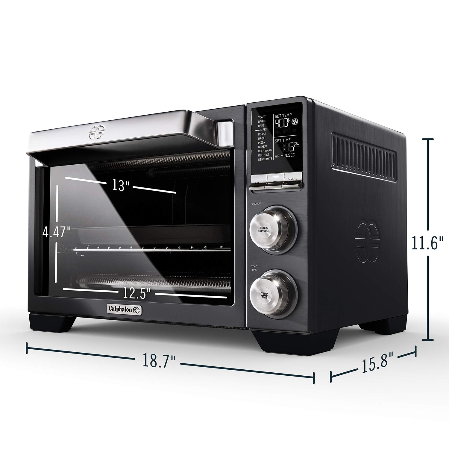 Details: The Calphalon Performance Air Fry Countertop Oven offers versatility with 11 cooking functions in a modern, space-saving design. This premium convection oven features Quartz Heat Technology, which delivers 40% more even heat* for consistent crisping and even browning, and preheats quicker to save you time. Add a delicious crisp to foods with the Air Fry function or choose from any of the other precision cooking functions including Bake, Toast, Bagel, Roast, Broil, Pizza, Reheat, Keep Warm, Defrost, and Dehydrate. The large capacity fits a 12-inch pizza and up to 6 slices of bread, and includes a removable crumb tray for an easy cleanup. A high-contrast LCD screen provides an exceptional cooking experience and an interior light makes it easy to monitor food as it cooks. From air frying to toasting, the Calphalon Performance Air Fry Countertop Oven allows you to countertop cook like never before. (Compared to conventional tube heating elements).