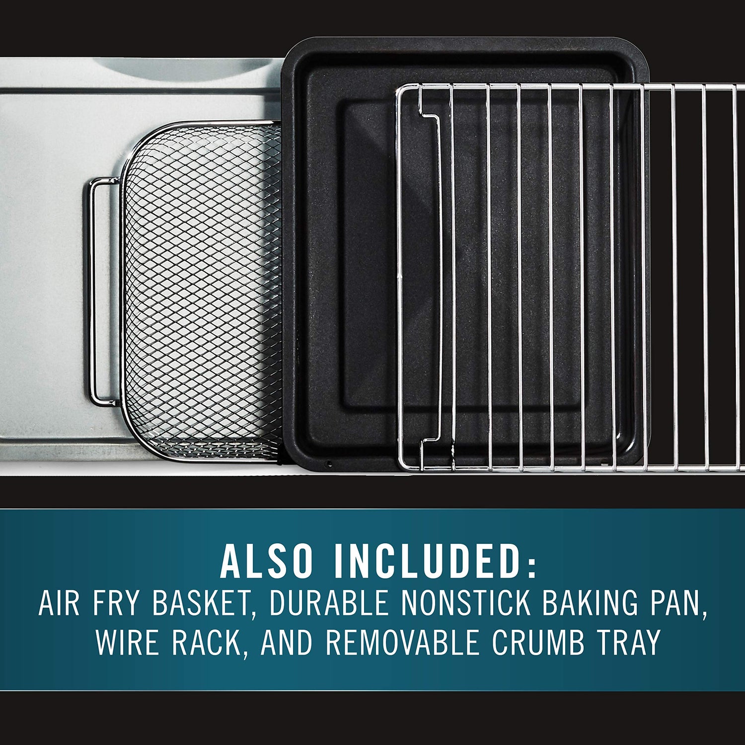 - Includes: Air Fry Basket, Durable Non-Stick Baking Pan, Wire Rack, and Removable Crumb Tray