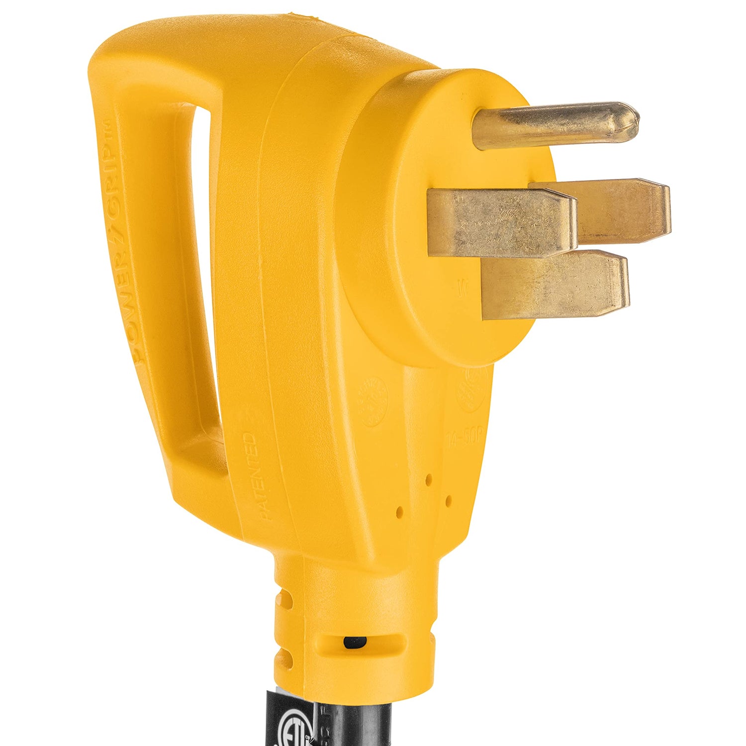 - Secure Grip Handles & 90° Head: Easily power your EV or camper with a Power Grip handle that allows safe plugging & unplugging without strain. A 90° head reduces stress on the EV/RV cord connection, preventing pressure or damage.
