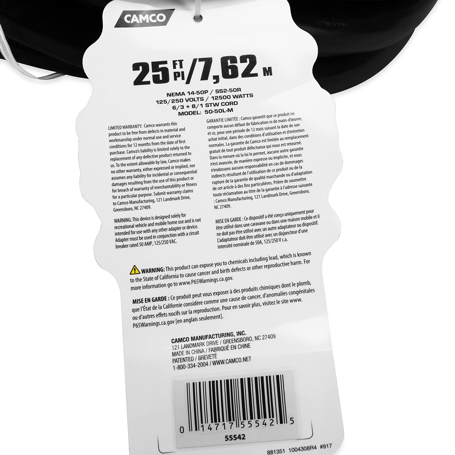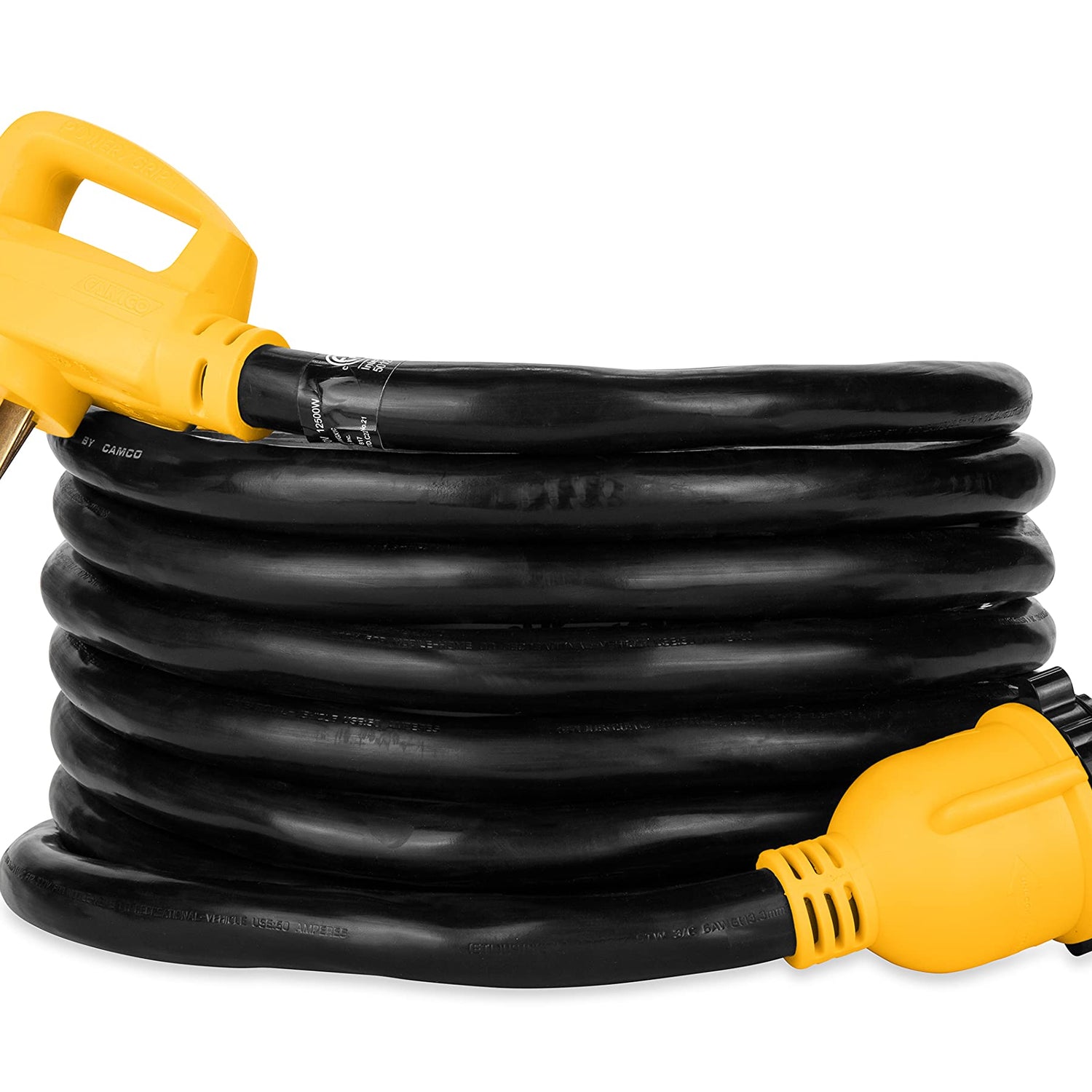 Camco Power Grip 25-Ft 50 Amp RV Extension Cord - Rated for 125/250 V/12,500 W - Features Copper 6/3 + 8/1-Gauge Wires for Superior Conductivity & Coated w/Heat-Resilient PVC (55542)