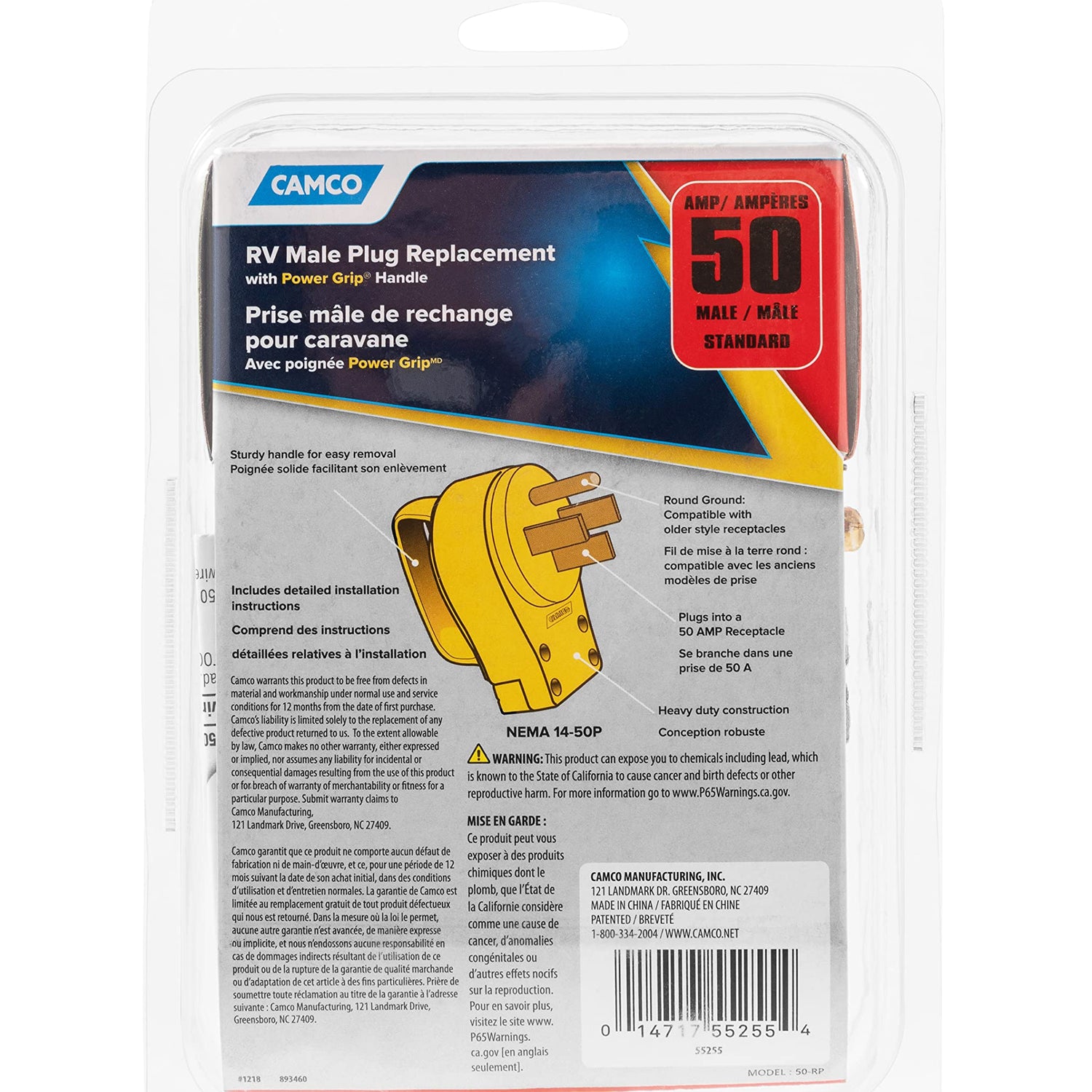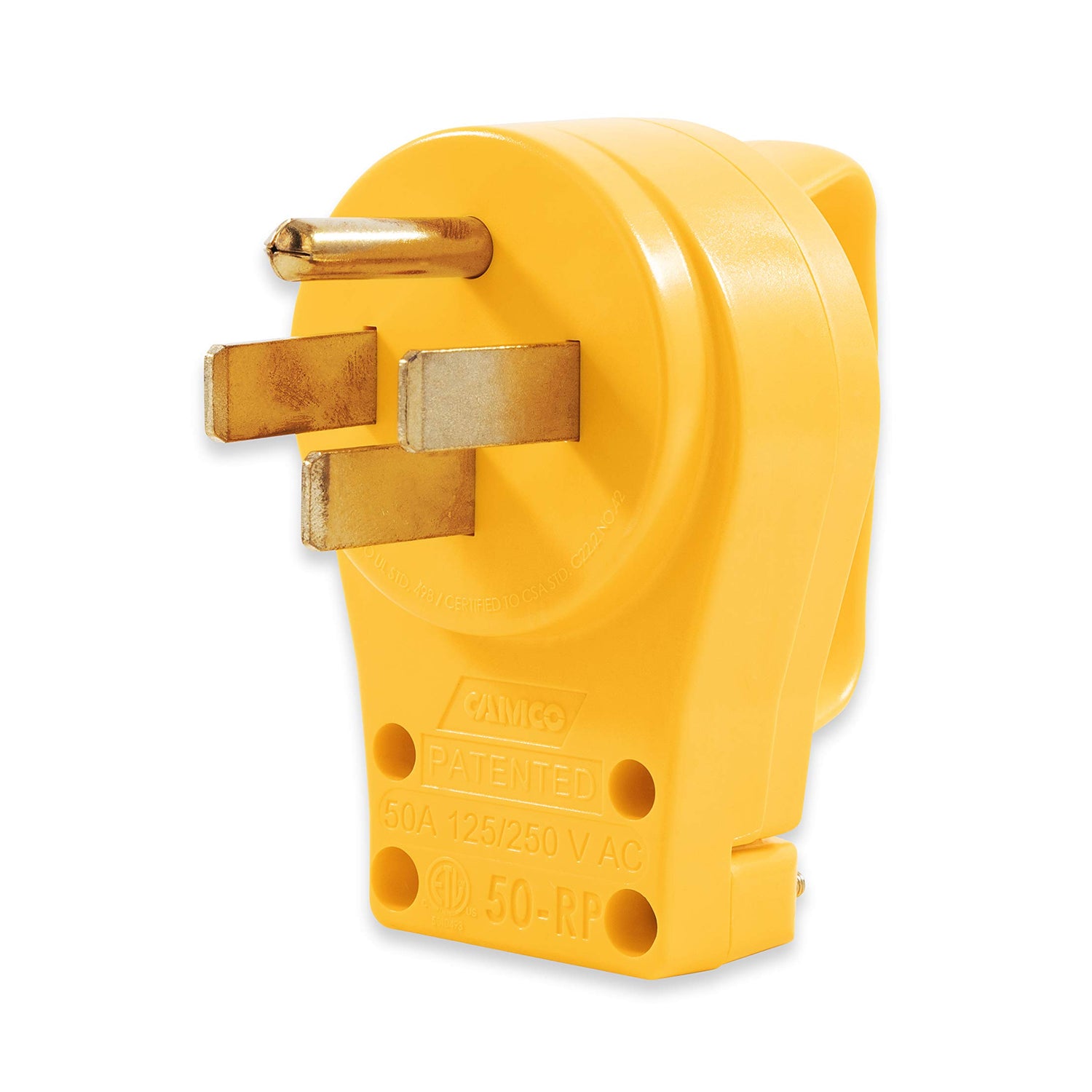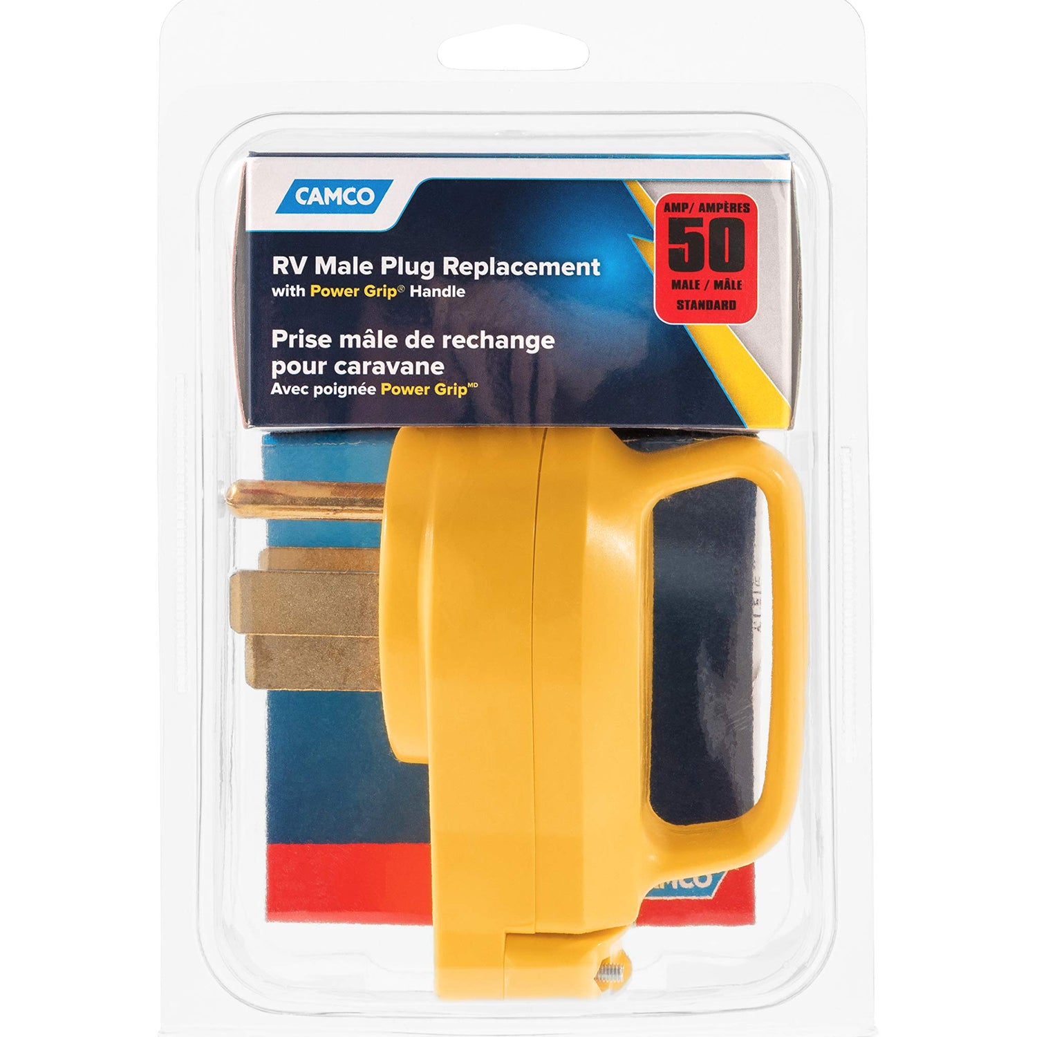 - RV Replacement Plug with Handle: Upgrade your RV power cord with Camco's RV 50A Male Plug Replacement. This RV camping accessory allows you to easily attach a standard 50A head to your existing 50 amp RV extension cord for uninterrupted adventures.