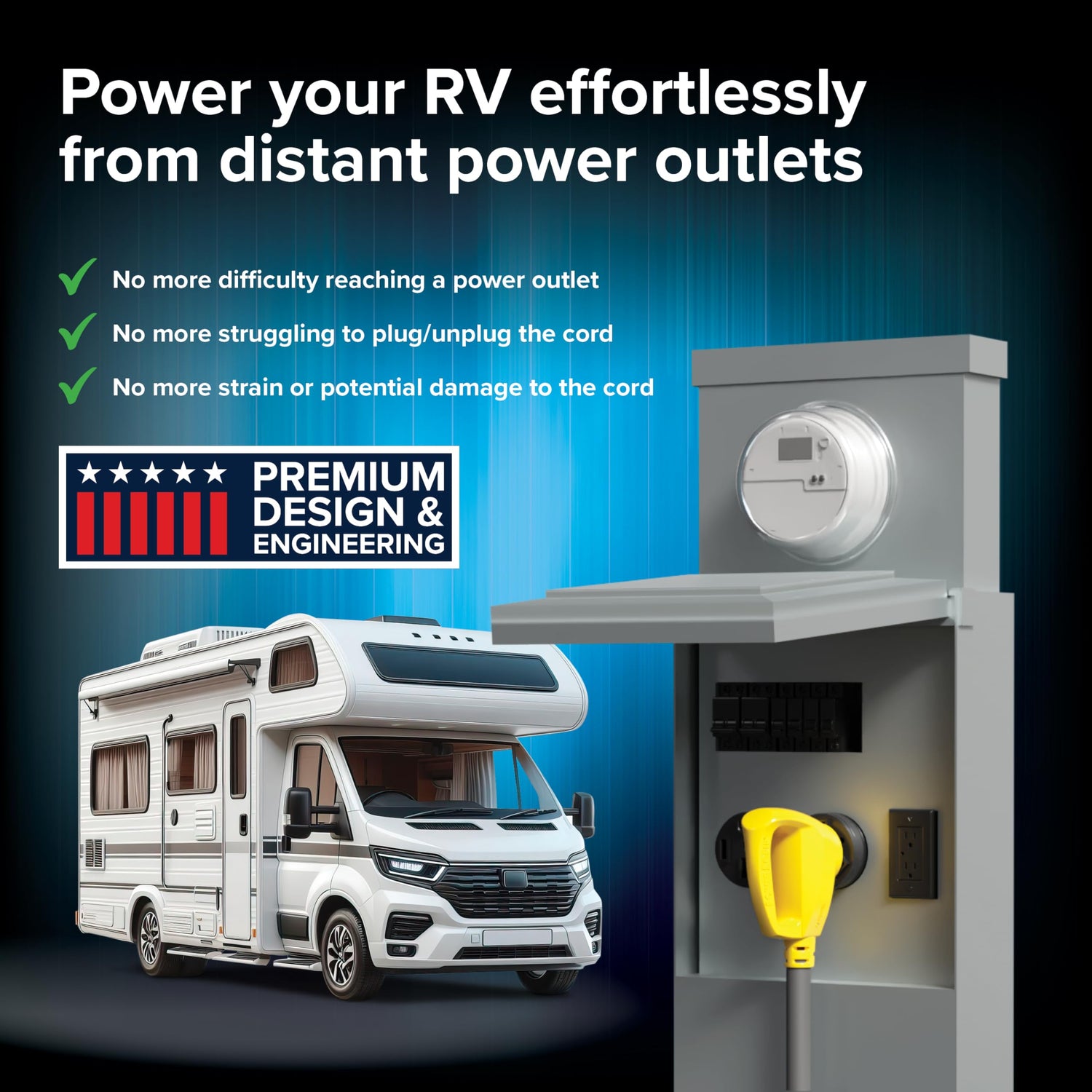 - Secure Grip Handles & 90° Heads: Easily power your EV or camper with Power Grip handles that allow safe plugging and unplugging without strain. 90° Heads reduce stress on the EV/RV cord connections, preventing pressure or damage.