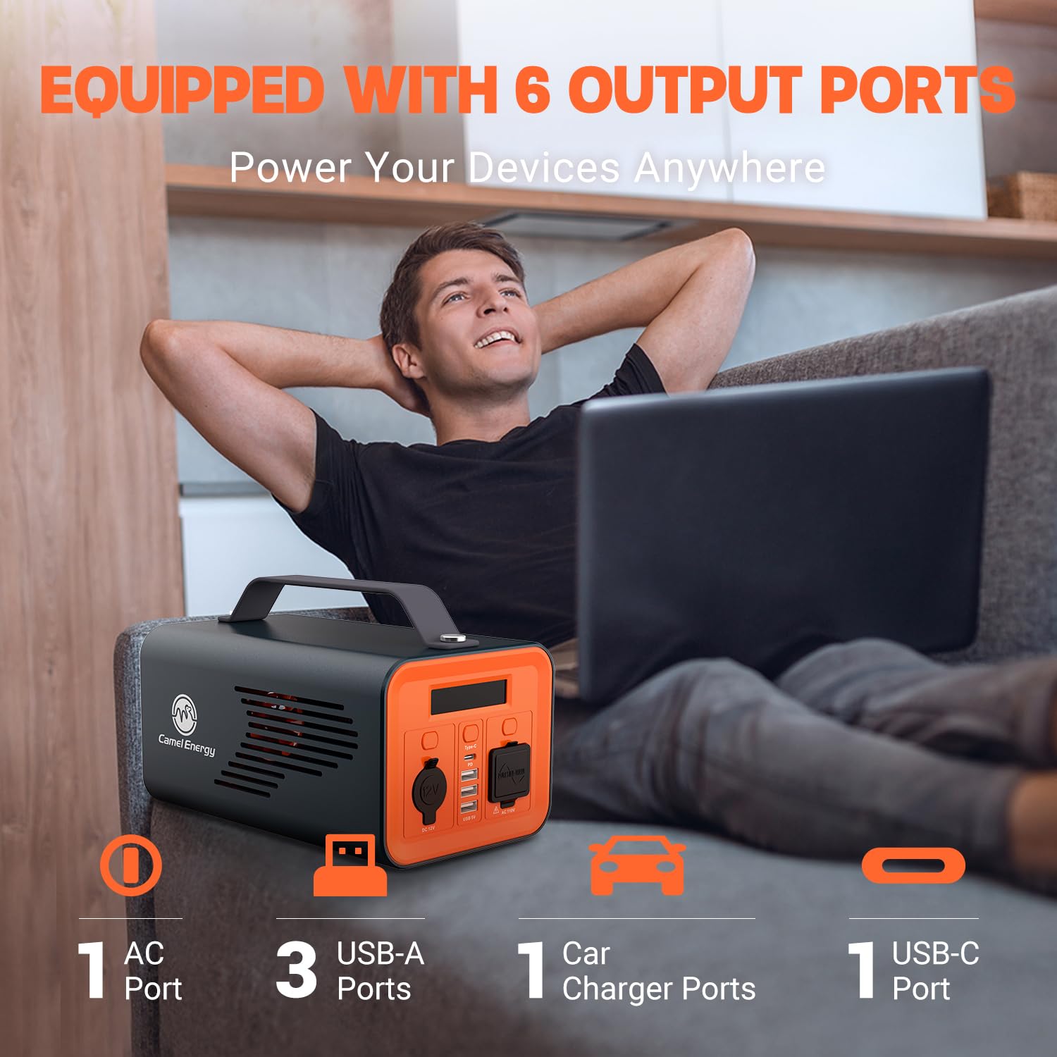 - Power Anytime Anywhere: Featuring 1* AC outlet(200W), 1* PD 60W USB-C port (input/output supported) , 3*USB-A port and 1* DC car port, the power station charge 6 devices at the same time to meet your needs.