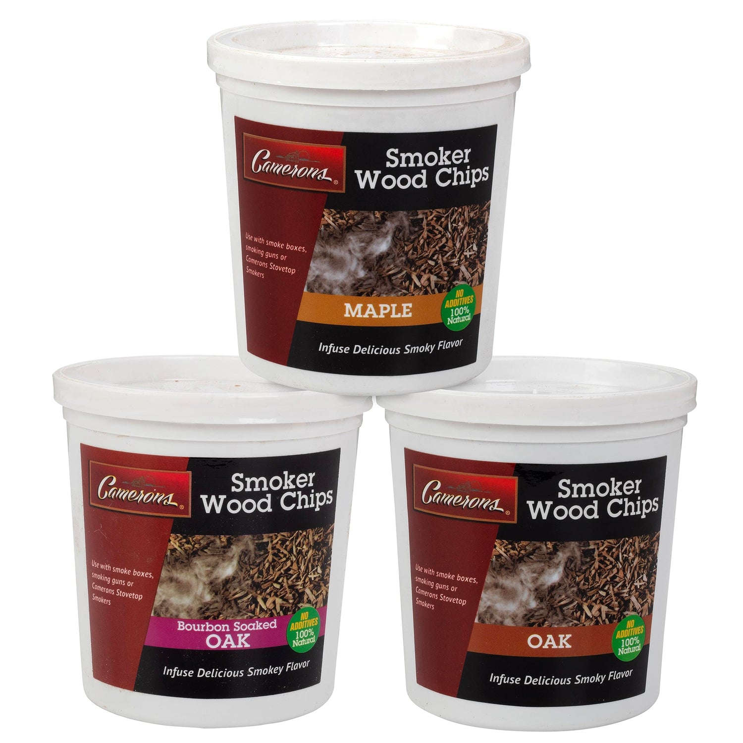 Camerons All Natural Extra Fine BBQ Wood Chips, 3 Pack - Bourbon Oak, Oak, Maple (3 Pints, 0.473L ea) - Kiln Dried Sawdust Shavings for Smoking Guns, Smokers, Smoke Boxes - Barbecue Grilling Gift Set