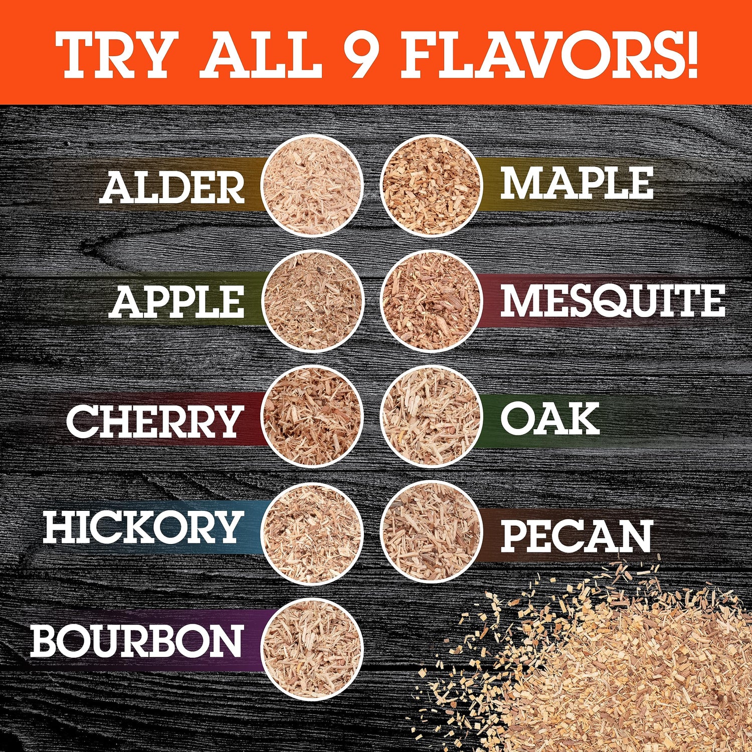 - Bourbon Oak, Maple, and Oak wood chips all pair well with poultry, beef, pork, and seafood. Maple is a delicate and mild flavor, Bourbon Oak is a sweet flavor, and Oak has a medium earthy profile.