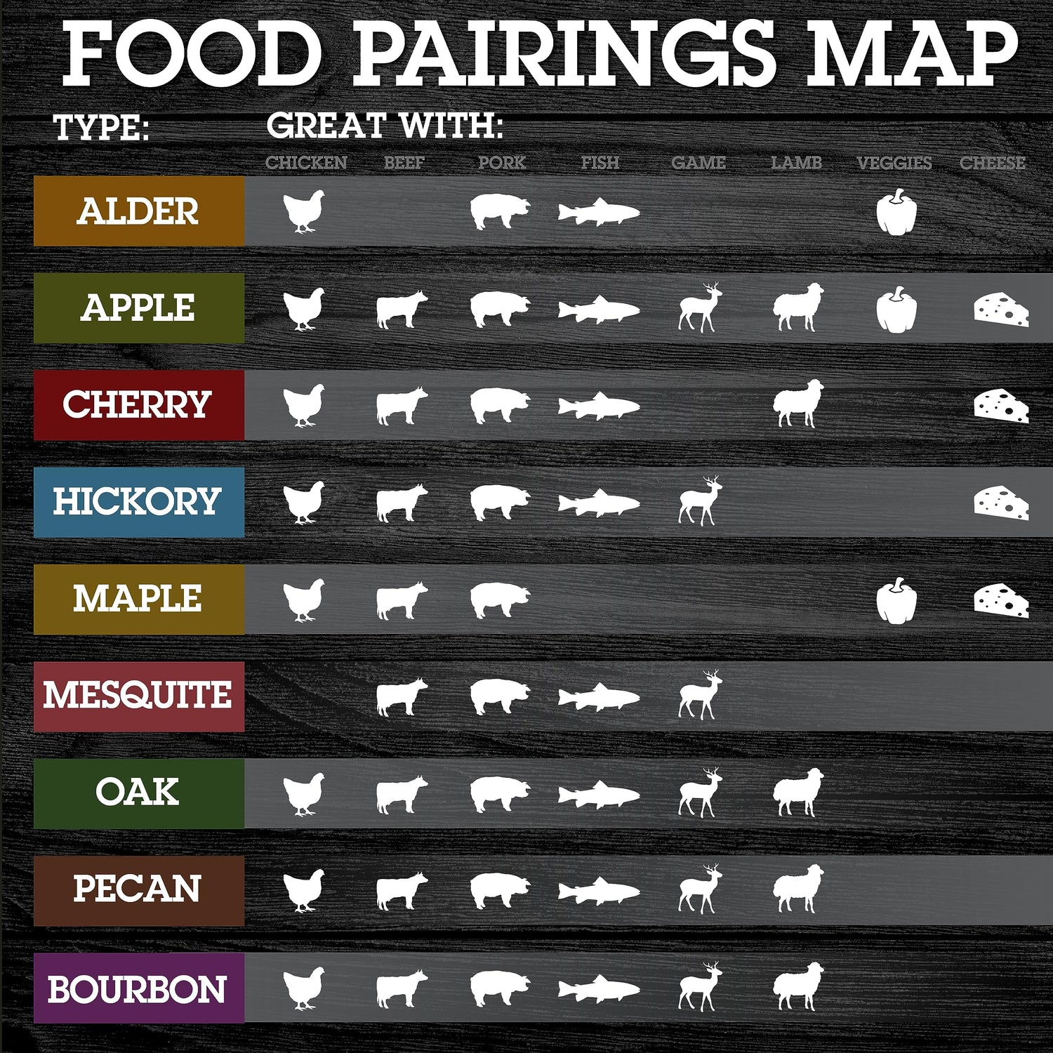 - Alder, Cherry, Oak, and Hickory wood chips all pair well with poultry, beef, pork, and seafood. Cherry is a subtle and sweet flavor, Alder is a light delicate flavor, Hickory is savory and rich, and Oak is a popular medium earthy flavor.