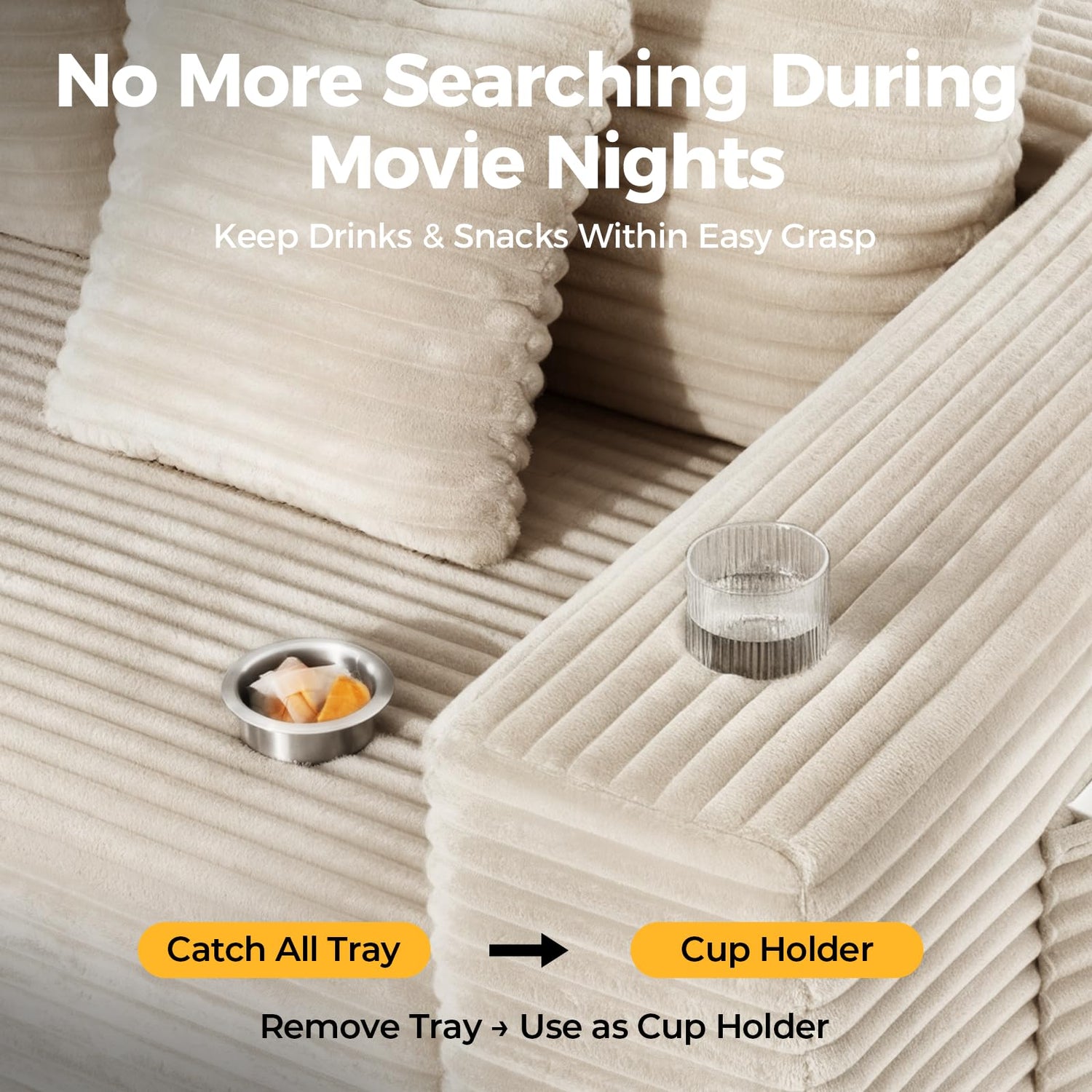 - [4 Storage Pockets & 1 Removable Catch All Tray]:The main seat's armrest features a versatile removable tray or storing small items like earrings and car keys. When the multi-function tray is removed, the interior sofa cover doubles as a cup holder for drinks.Plus, enjoy four built-in fabric pockets (two on each side) designed to hold books, magazines, or tablets - keeping your living space neat and everything within easy reach.