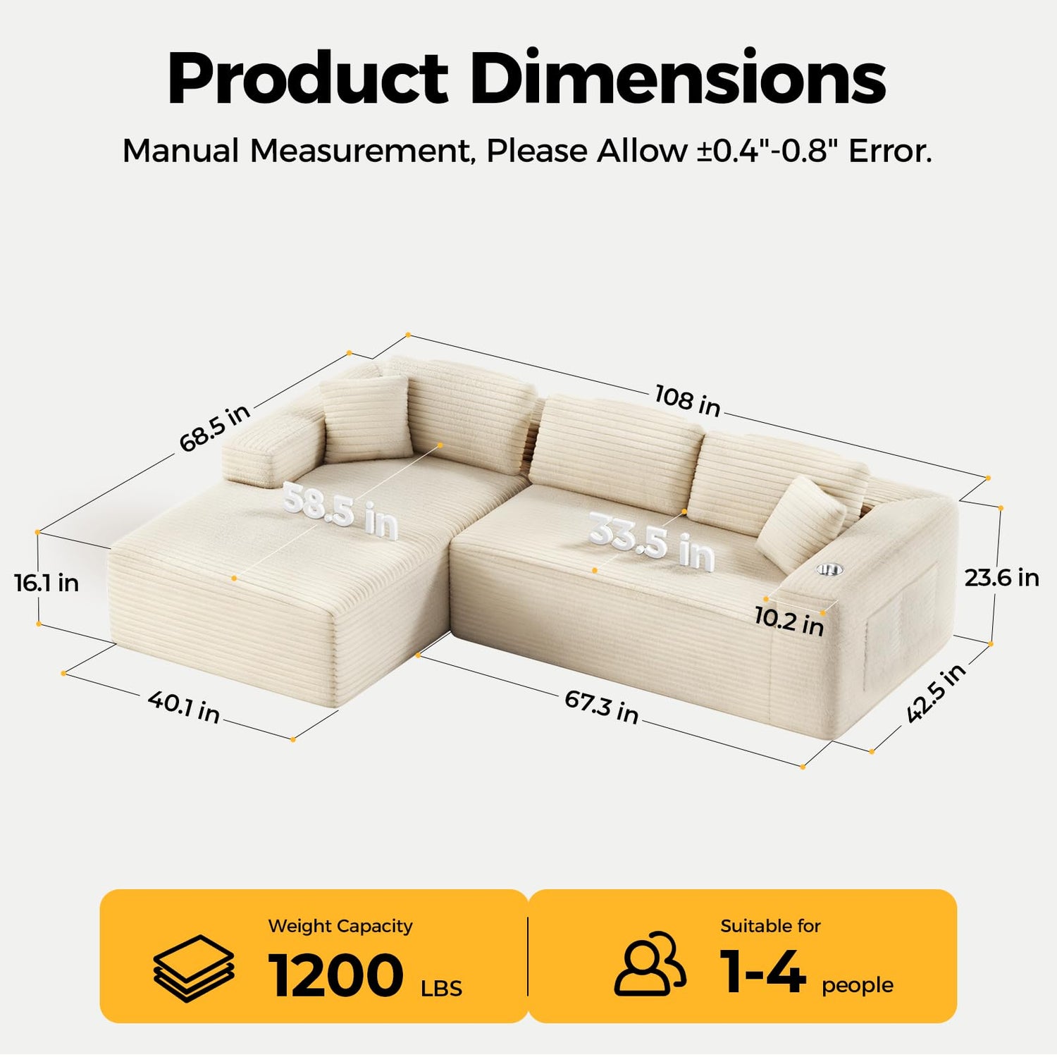 - [Extra 19% Deeper Seat]: Designed for full-body stretch, this sectional couch features an 33.5in deep seat which 19% deeper than standard sofas—allowing you to stretch out and unwind in total comfort. Perfect for tall users or anyone who loves extra room, the oversized design (68.5" D x 108" W x 23.6" H) transforms your living room, bedroom, or reading nook into a personal relaxation haven.This minimalist L shaped couch maximizes space when placed against a wall.