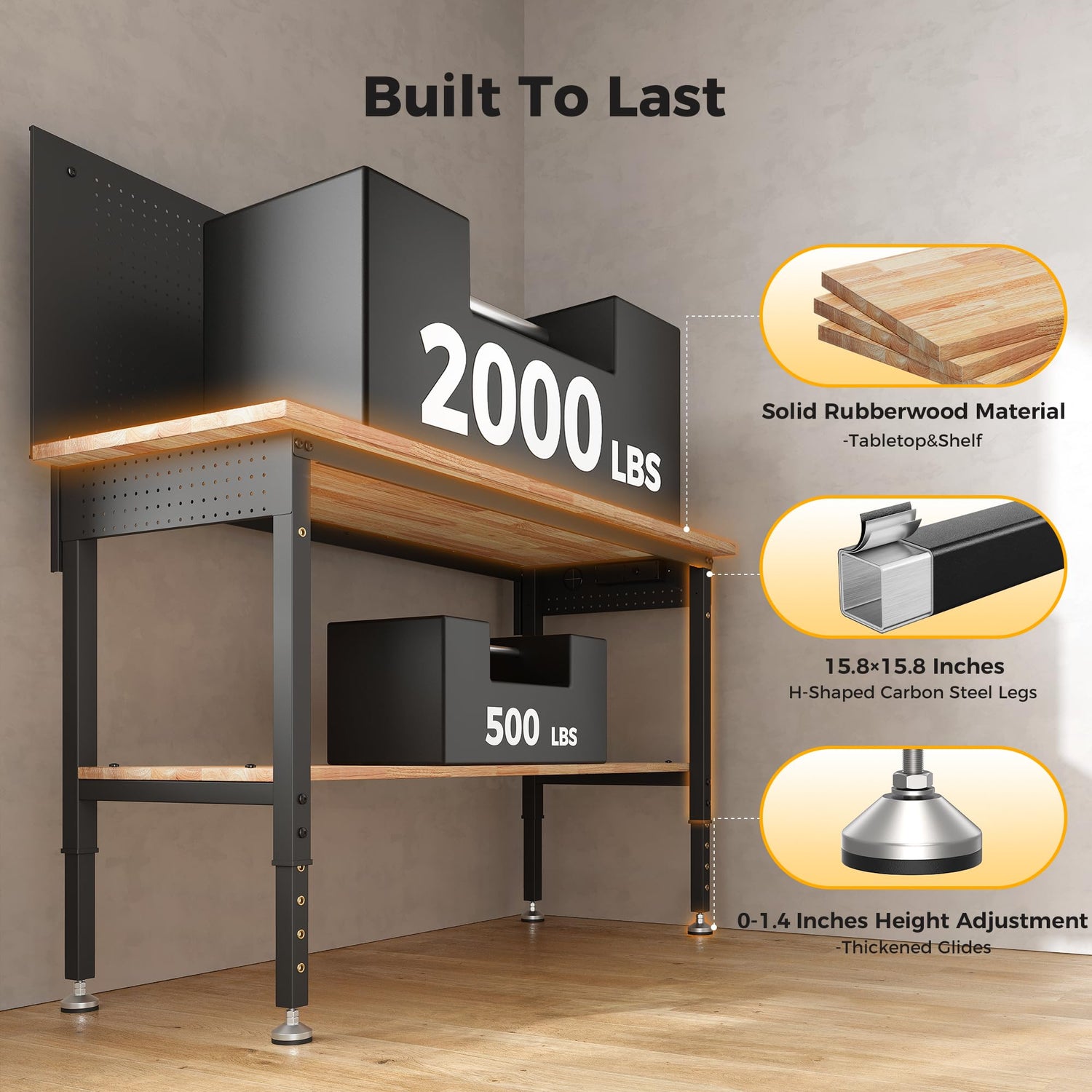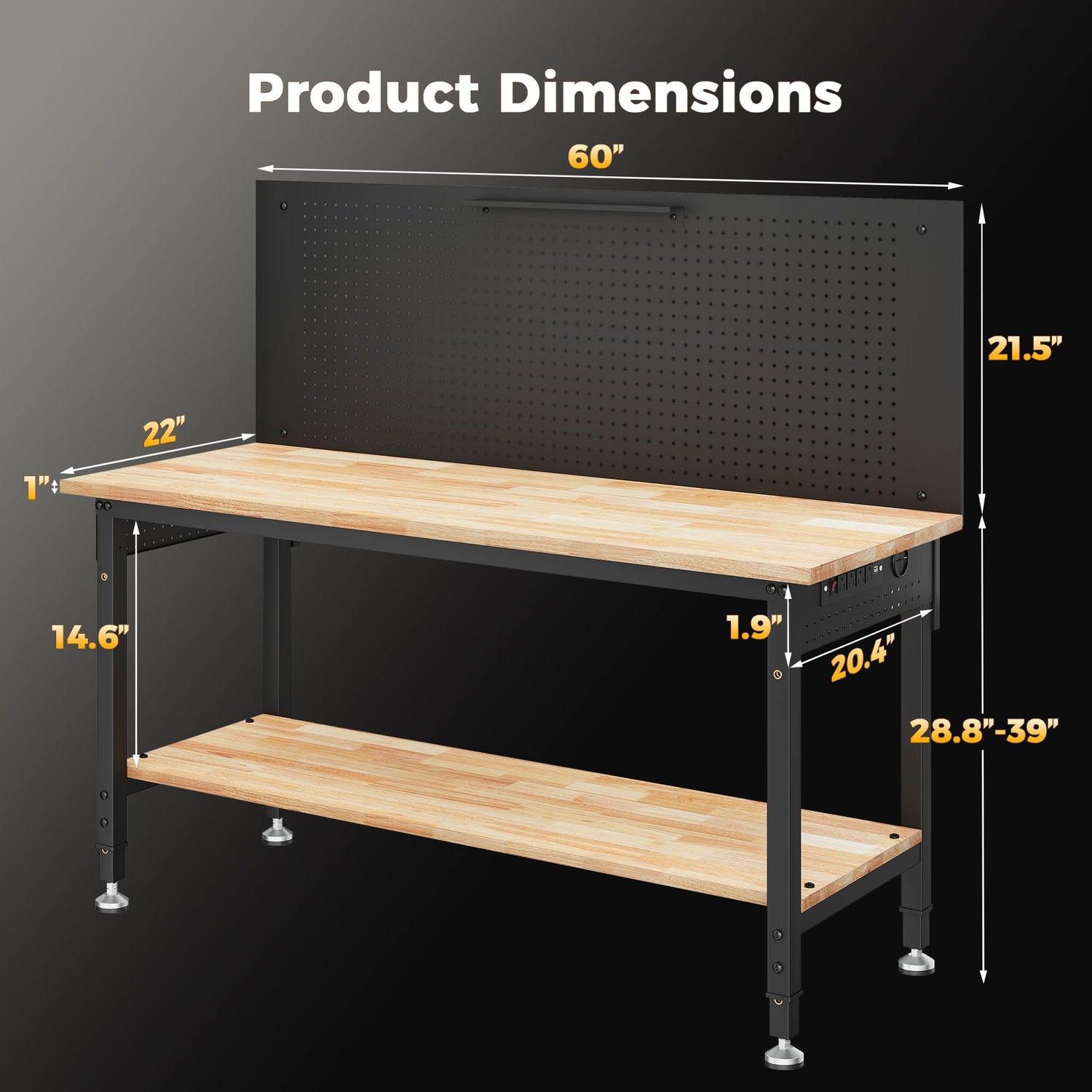 CAMMOO 60" Work Bench Adjustable Height with Storage Shelf, Max Load 2000 LBS Heavy Duty Rubberwood Tabletop with Pegboard, LED Light, Built-in Power Strip for Woodworking Shop, Garage, Home
