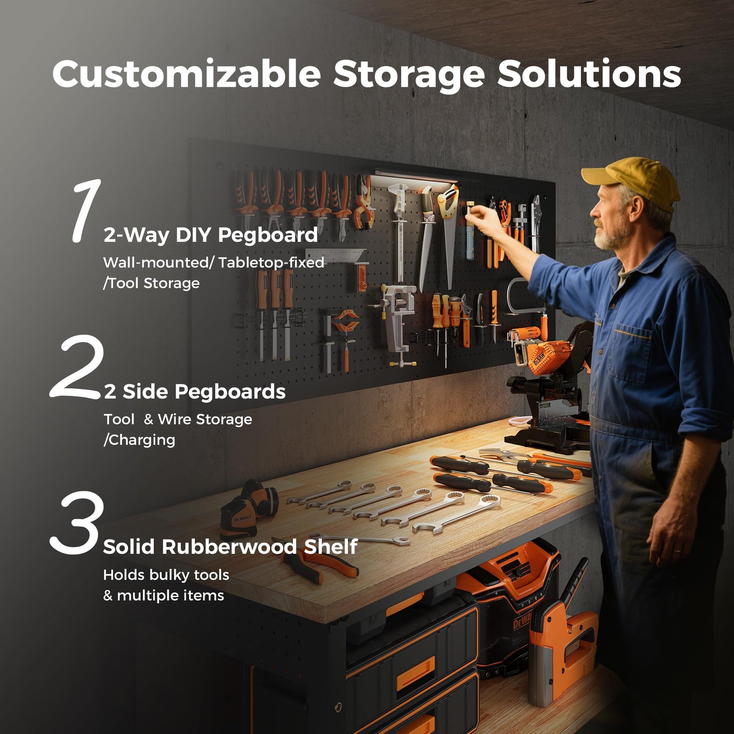 - Customize your storage:The top pegboard can be mounted to a table or wall to hold a range of tools, while the pegboards on each side offer basic storage needs and easy to take. Heavy-duty equipment and additional storage choices can be kept on the solid rubberwood shelf below the table.When working, the tabletop may be made more organized by attaching the magnetic LED light to the pegboard.