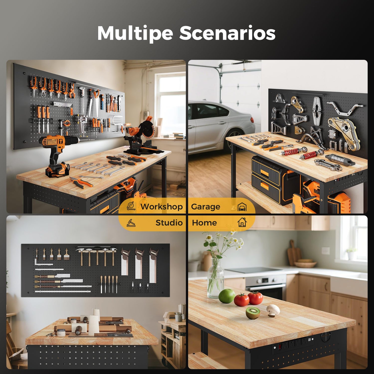 - Easy Setup: Assemble the pre-installed pegboards on both sides of the table legs' H-shaped construction, your setup will be quick and easy. Other attachments and all pegboards do not require drilling. Apart from detailed installation instructions to ensure a rapid and simple installation, we also offer clear step-by-step installation videos right on this page. Whether you’re working in your garage, office, home, or commercial space, this workbench is fully customizable to meet your needs, perfect for woodworking and a variety of tasks.
