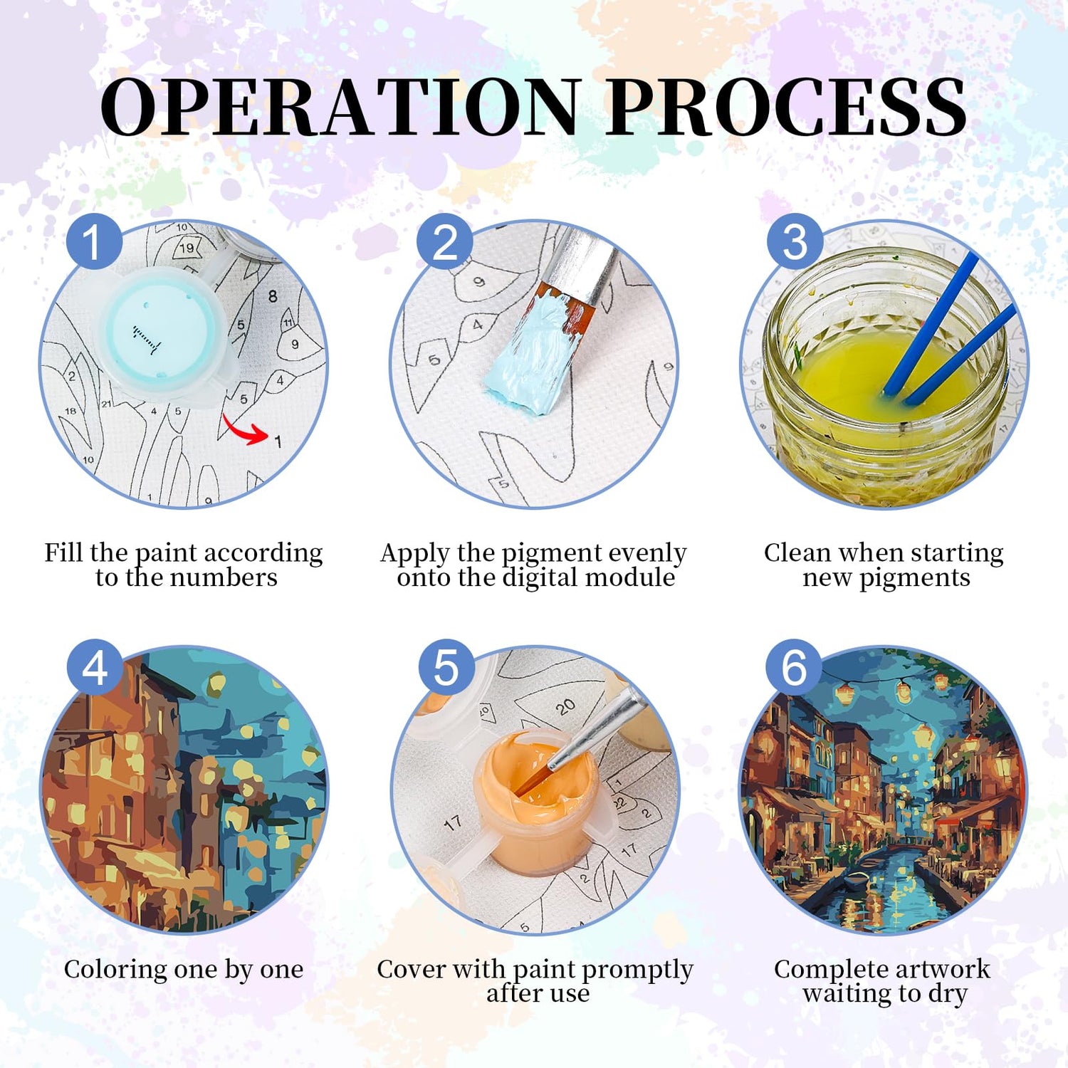- 【What Will You Get】DIY paint by numbers kit for adults has a complete tool kit, including 3 x black nylon brushes, 1 set of acrylic paints, 2 x wall-mounted hooks & screws, 1 x color postcard Guide, 1 x HD color canvas and 1 x paper number reference.Open the package and you can start painting immediately.