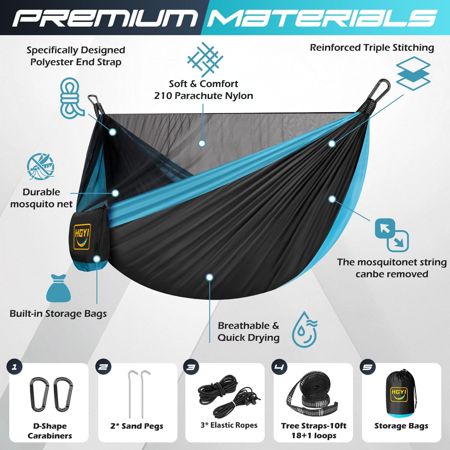 - Portable & Easy Setup Design:This hammock is Lightweight and portable (approx. 1000g) and comes with a compact carry bag and assembly accessories (e.g hooks, tree straps). No tools required! Quick and hassle-free setup makes it perfect for camping hammock for adults adventures like camping,hiking.Simply hang between two trees or stands, and your camping hammock with mosquito net is ready in minutes