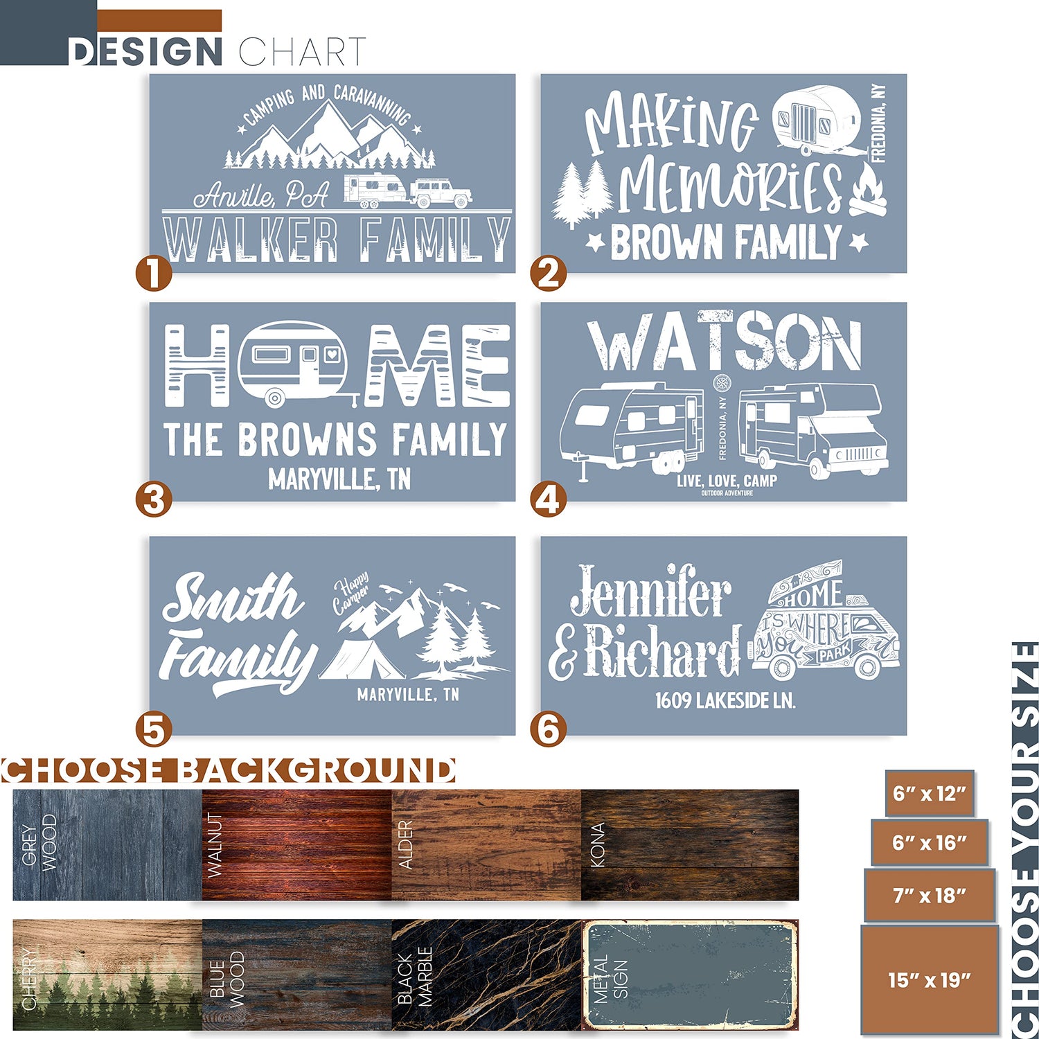 • DIFFERENT SIZE CUSTOMIZABLE CAMPING WOOD SIGNS: All Personalized Camper Wood Signs can customizable with Name & Campsite Address. So, you can create your Custom Camping Wooden Boards. We offer 2 text lines option for typing your informations. This order includes a Personalized Wood Sign. The Customized Wooden Signs sizes are 6x12/6x16/7x18/15x19 inches. Thickness : 0.25 Inches. Rv Trailer Mountain etc. Wood Sign is made of 100% pine wood. 8 Wood Color and 6 Design options.
