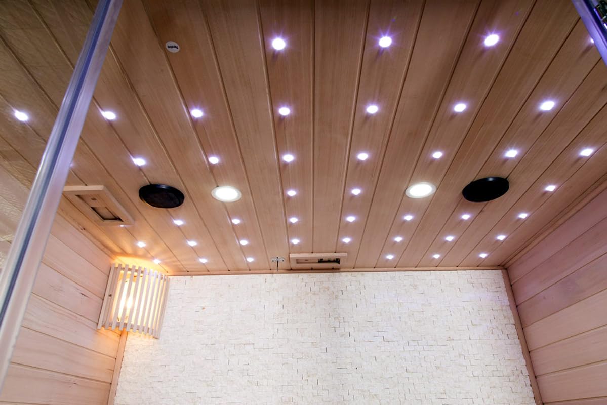 - 100% Factory Sealed and Tested, Includes: Water Bucket, Ladle, Timer, Rocks, thermometer, hygrometer, LED Ceiling Star Lighting, LED reading light, rock wall / backsplash, interior + exterior control panel + Audio panel upgrade, towel rack, cup-holder, stainless steel exterior door handle, 2 speakers, and more.