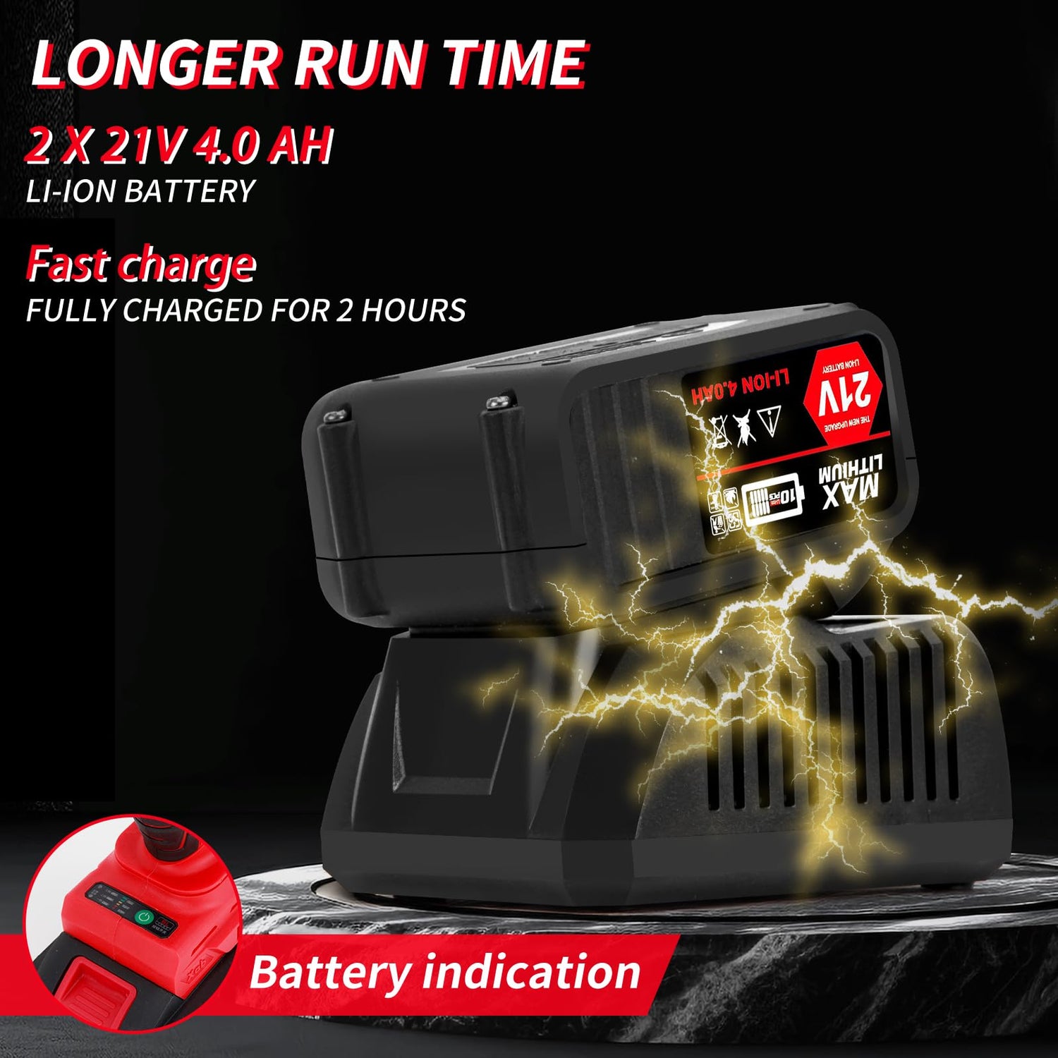 - 🛠️2*4.0AH BATTERY + FAST CHARGER - The most important problem of the battery impact wrench is the battery power, this is not a worry at all, our rechargeable electric wrench is equipped with 2 4.0Ah lithium batteries, compared to 2.0Ah batteries, can extend the use of more than 50% of the battery life. The charger can fully charge the battery in 2 hours, improving your work efficiency.