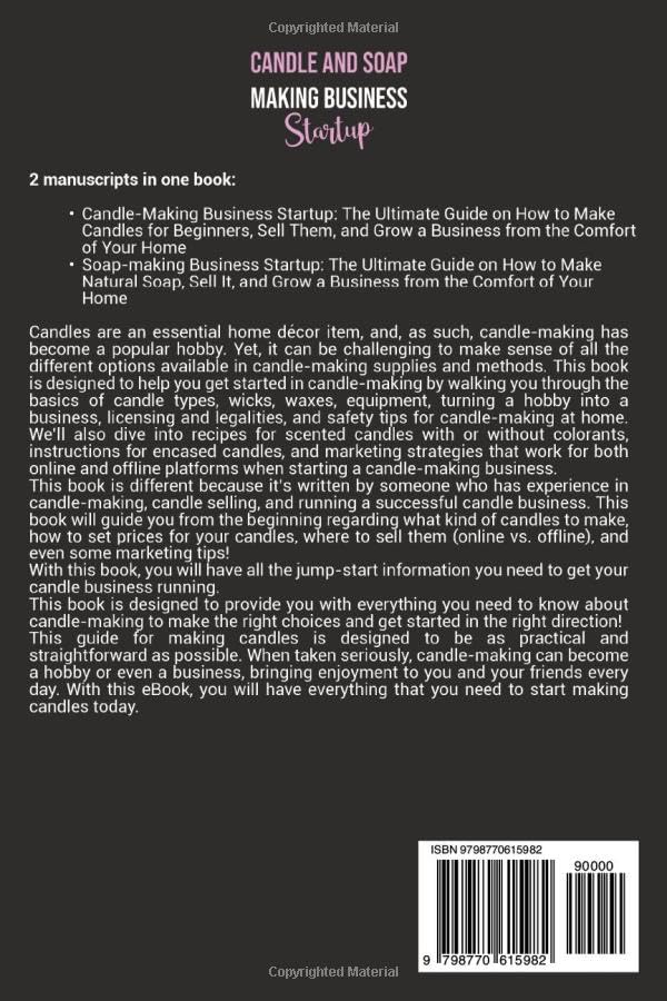 Details: Two manuscripts in one book: Candle-Making Business Startup: The Ultimate Guide on How to Make Candles for Beginners, Sell Them, and Grow a Business from the Comfort of Your Home Soap-making Business Startup: The Ultimate Guide on How to Make Natural Soap, Sell It, and Grow a Business from the Comfort of Your Home