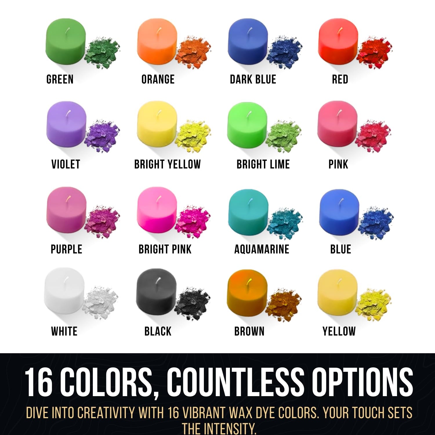 - VIBRANT COLOR PALETTE --- Our candle dye for color making boasts an extensive selection of 16 INDIVIDUAL COLORS, allowing you to unleash your creativity with a wide spectrum of hues. From rich tones to soft pastels, each color is carefully formulated for intense pigmentation, ensuring vibrant and captivating results in candles. With such versatility, you can effortlessly personalize your creations, bringing your unique visions to life.