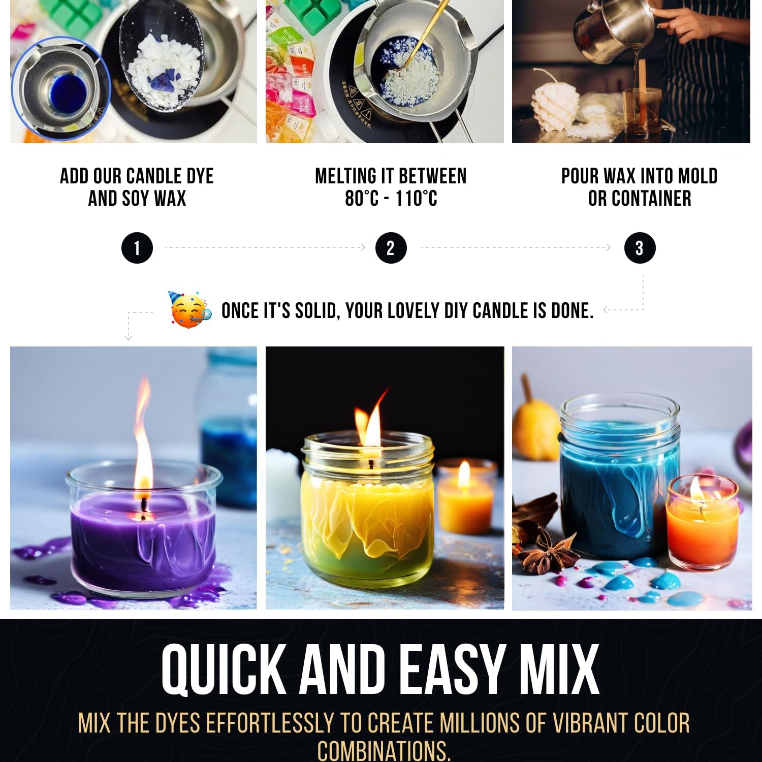 - HIGH SOLUBILITY --- Our wax dyes for candle making feature impeccable solubility, seamlessly integrating into various mediums for effortless blending and consistent color dispersion. Whether you're crafting candles, soaps, or bath bombs, our dye dissolves completely, ensuring uniform color distribution throughout your creations. Say goodbye to clumping and uneven coloring - our formula ensures smooth application and professional-quality results every time.