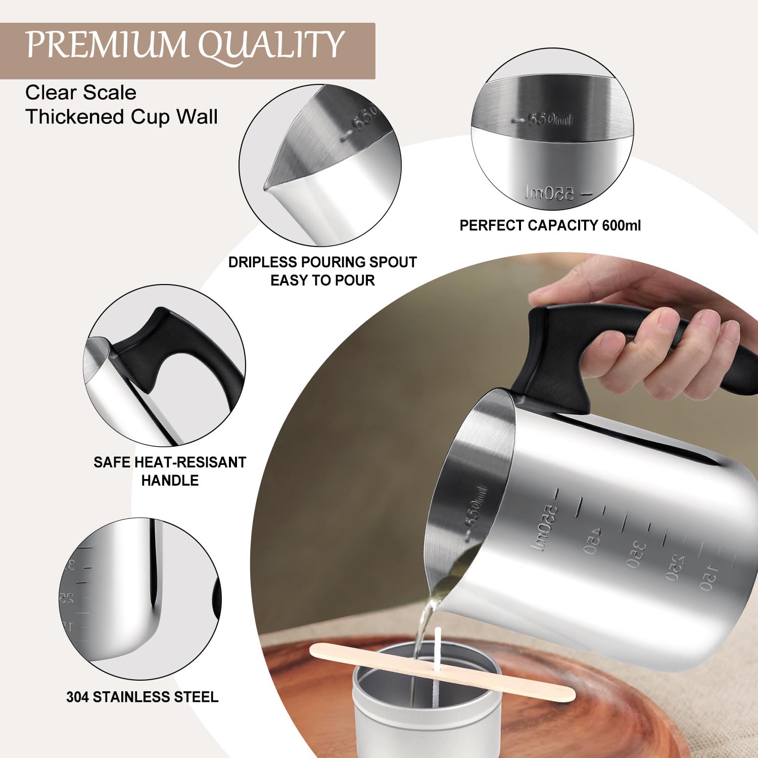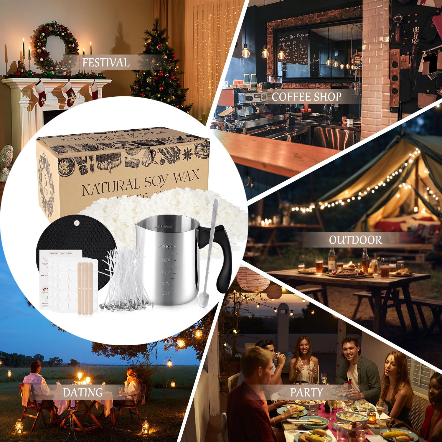 - Candle Making Supplies Kit:5 lbs soy wax flakes, 1*600ml stainless steel pouring pot with graduated scale, 1*stainless steel stirring spoon, 100*5 inch long cotton wick, 100 pcs glue stickers, 4*wooden candle wick holders, 1*silicone anti-scald mat