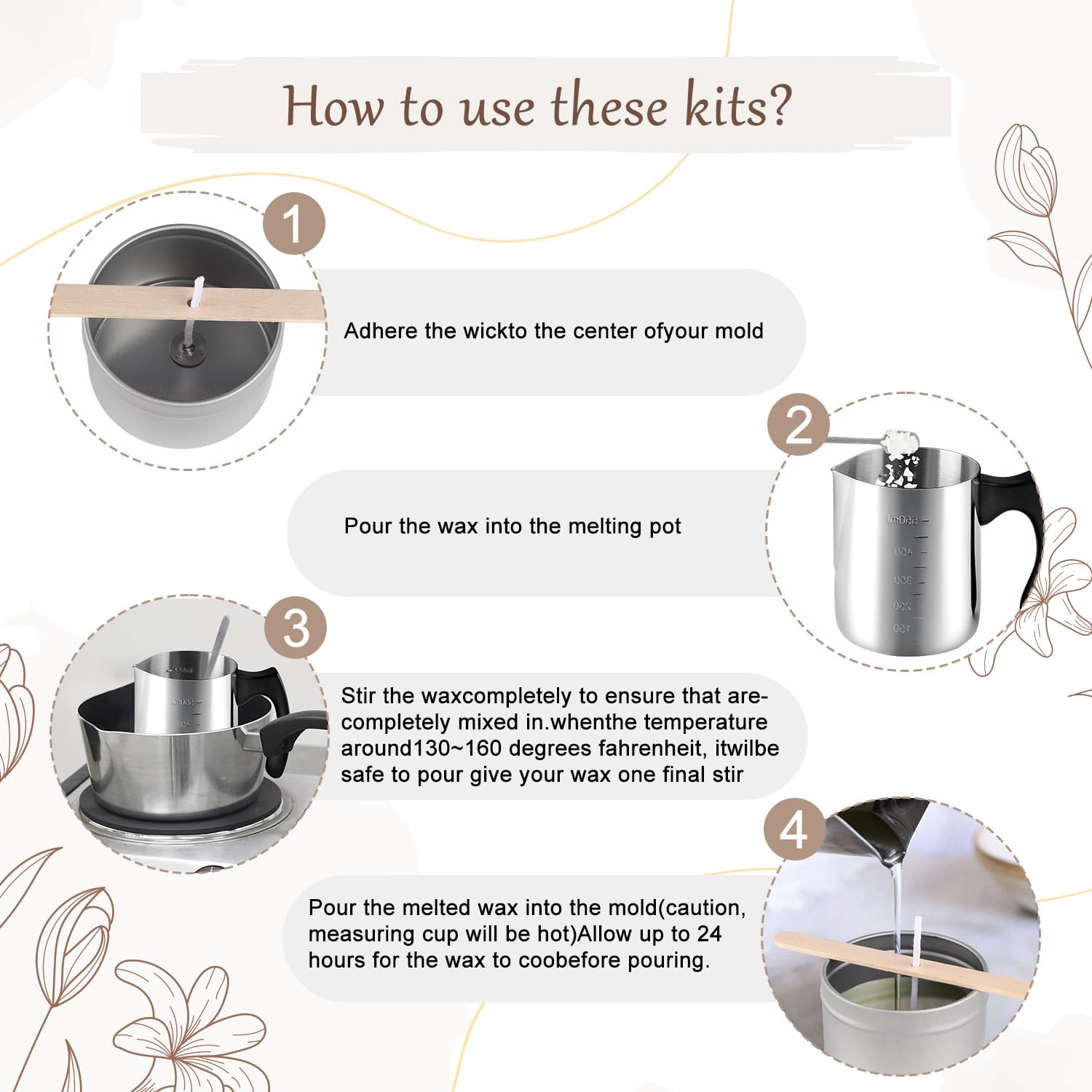 - Candle Making Kit for Beginners: Whether you are a beginner or an experienced hobbyist, just follow the steps of candle making: fix the wick→melt the wax→pour it into the container→wait for it to cool down, and then you can easily enjoy the fun of making candles!