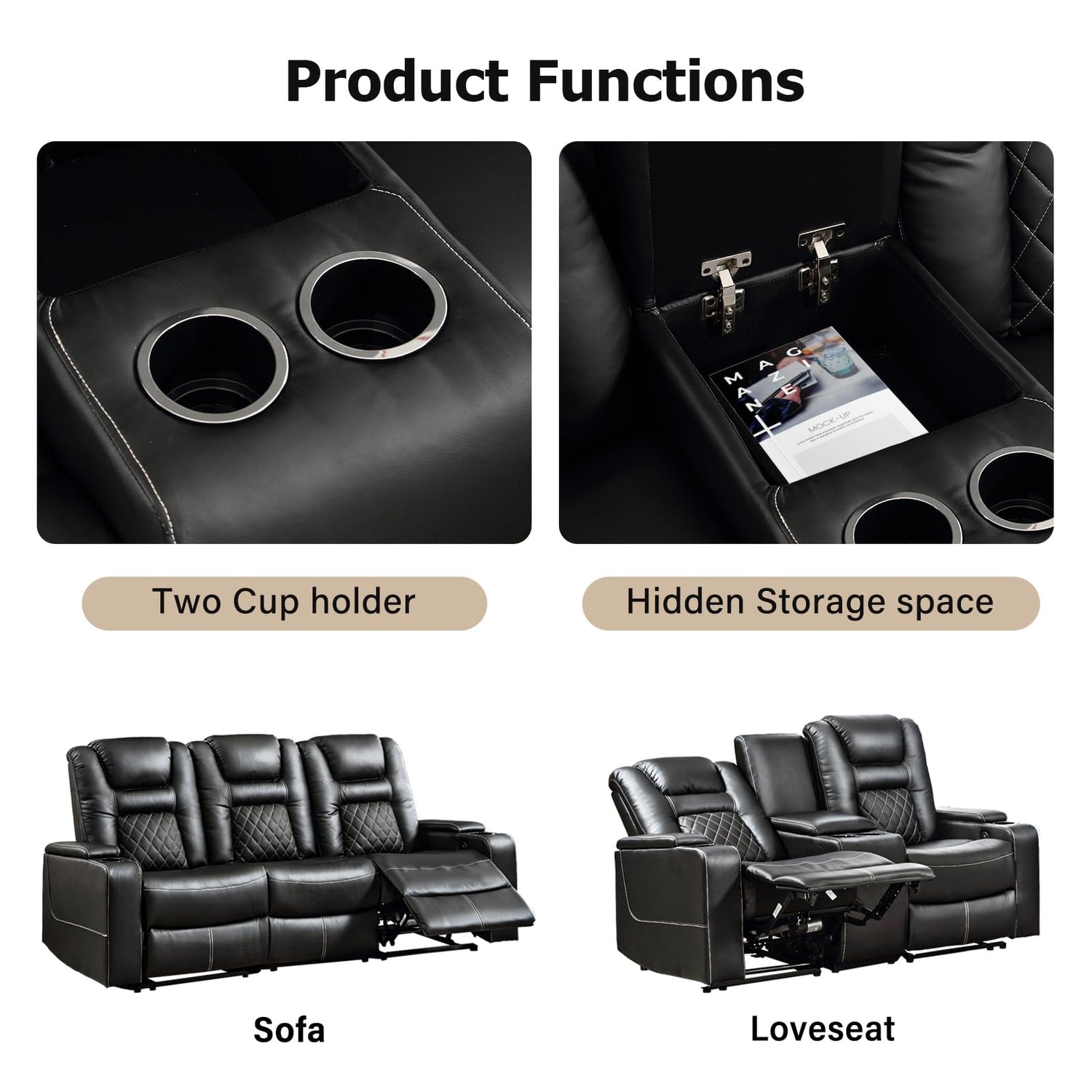CANMOV Home Theater Seating Seats, Theater Recliner Chair Sofa, PU Leather 3 seat Power Recliner Sofa with Cup Holders, Hidden Arm Storage, USB Ports,Black