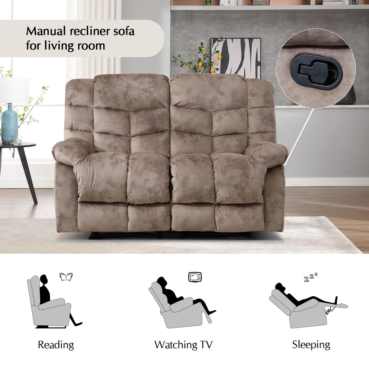 - 【Breathable Fabric Upholstery】This manual recliner sofa is crafted from short plush fabric, offering comfort and breathability while being durable, stain-resistant, and easy to maintain.