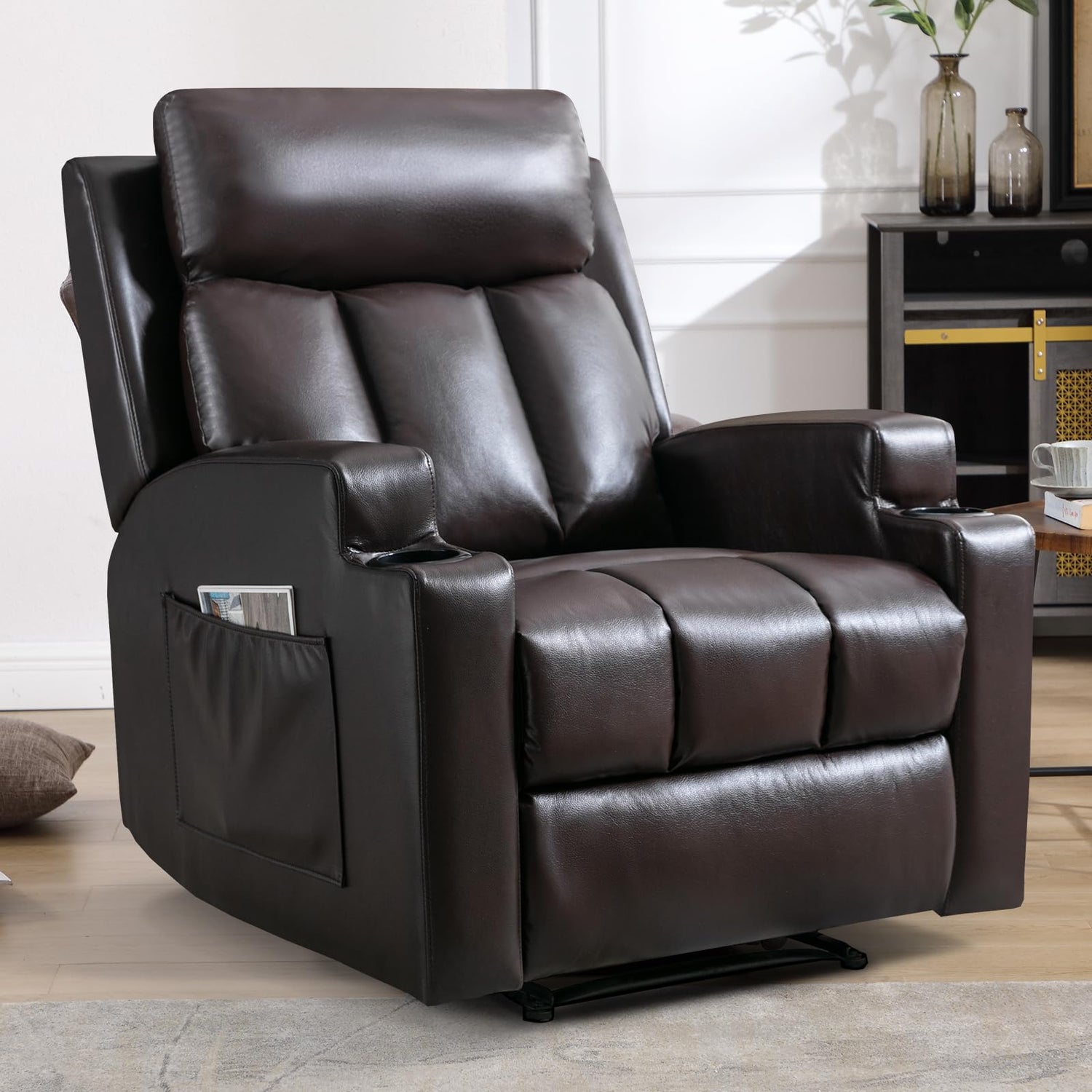 - Cup holders and Side Pocket: The recliner features a thickened padding design at the waist for comfortable support. The seat cushion is fully padded to ensure comfort even during prolonged use. It also comes with two cup holders and side pocket for storing drinks, phones, magazines, and remote controls.