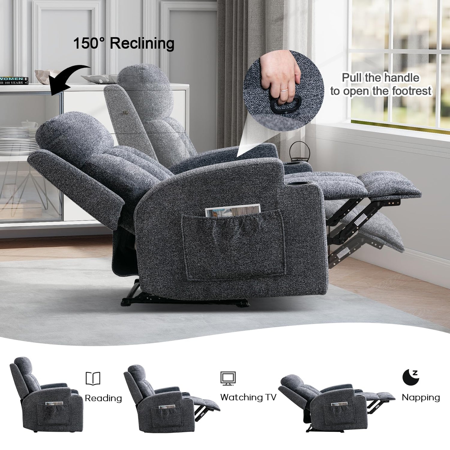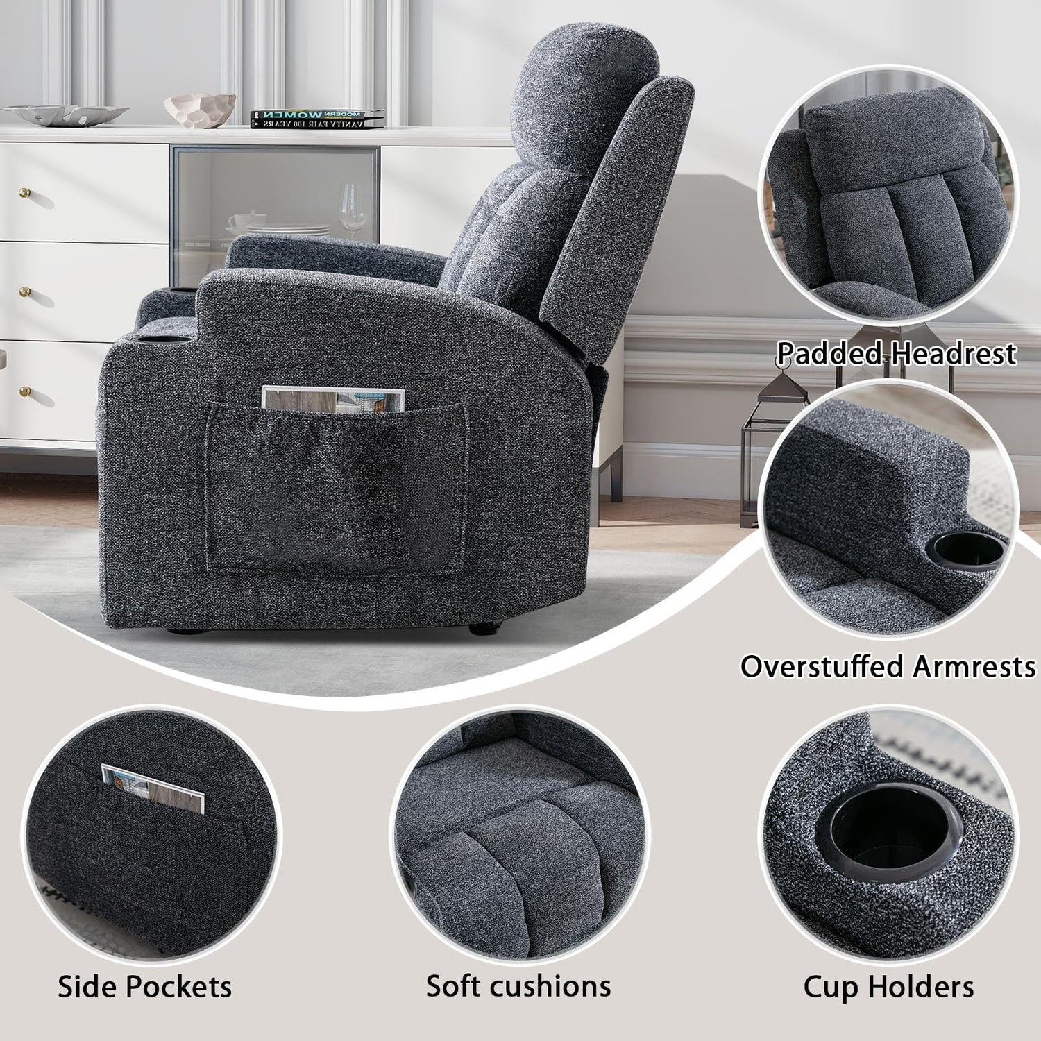- Cup holders and Side Pocket: The recliner features a thickened padding design at the waist for comfortable support.It also comes with two cup holders and side pocket for storing drinks, phones, magazines, and remote controls.