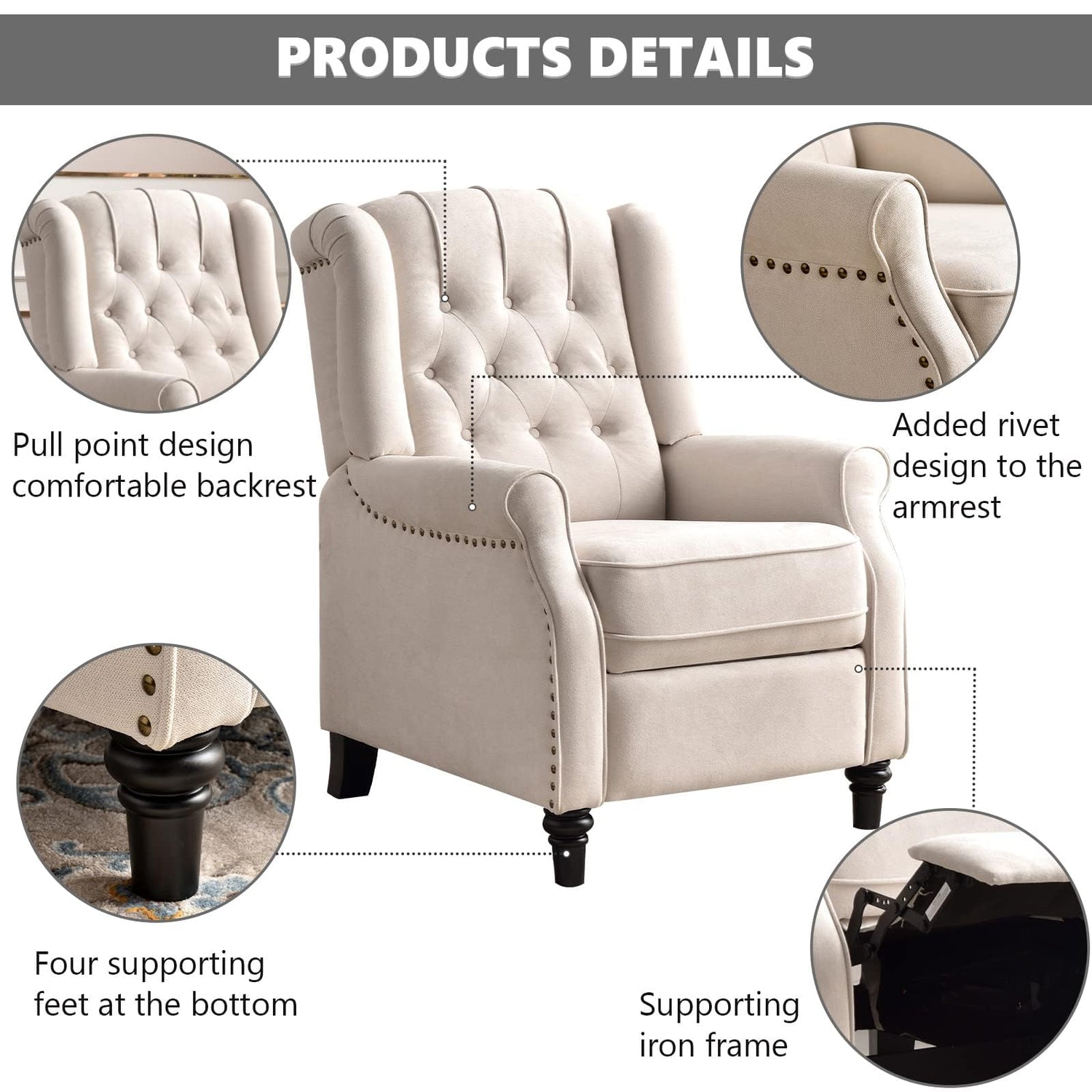 CANMOV Push Back Recliner Chair Set of 2, Elizabeth Fabric Recliner with Tufted Back Home Theater Seating w/Padded Seat and Nailhead Trim, Wooden Legs, Adjustable Single Sofa,White