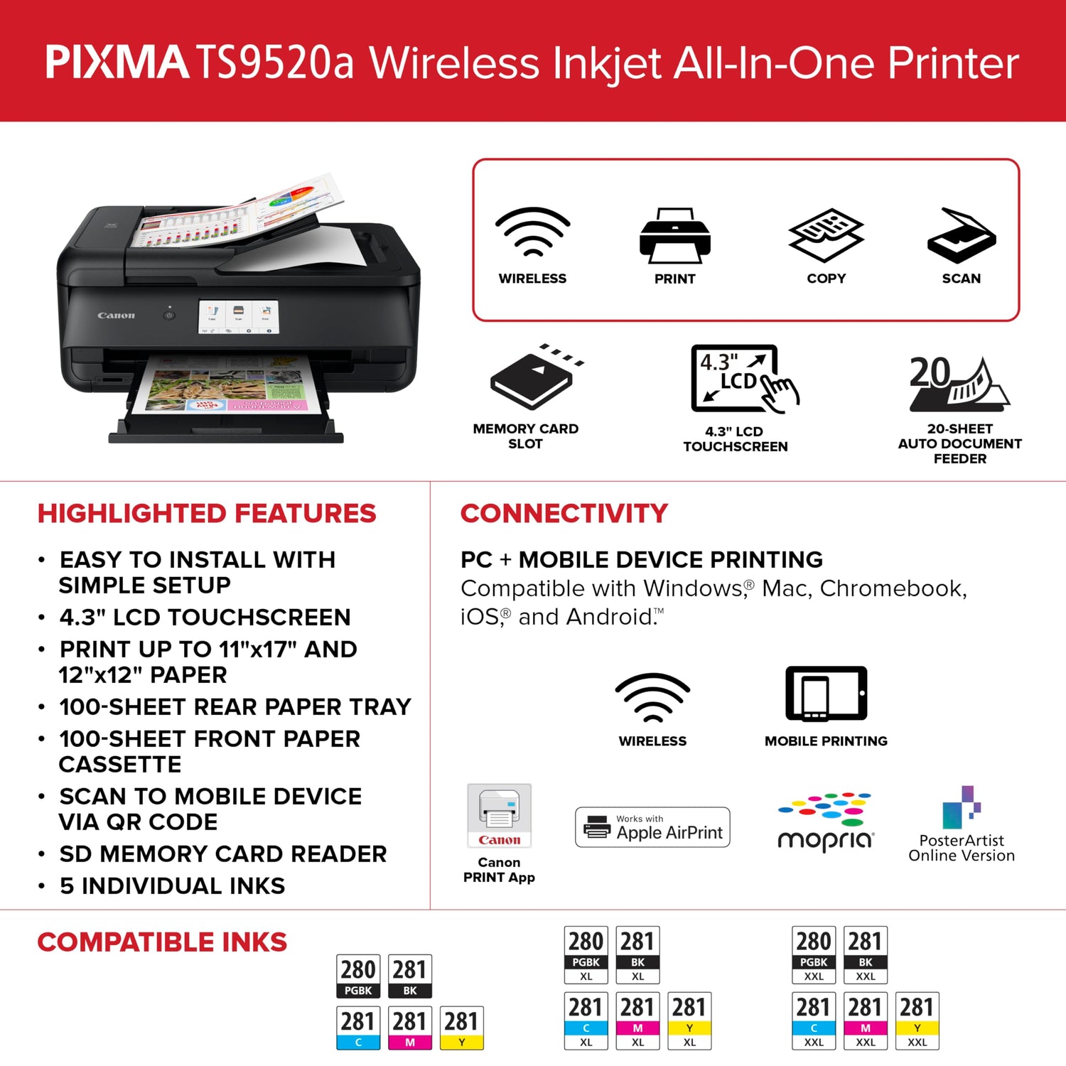 Details: Designed for home use, the Canon PIXMA TS9520a All-in-One inkjet printer delivers high-quality printing and outstanding wireless connectivity in a compact size. The PIXMA TS9520a is easy to set up and maintain and offers great media versatility to print on a variety of media types and sizes, including photo paper, envelopes, borderless photos, banners and more. Use Poster Artist Online to create professional-posters, banners and signage. Produce crisp, colorful documents and photos quickly and cost-effectively with fast print speeds. Keep printing with a plain paper capacity of up to 100 sheets in the bottom cassette, 100 sheets in the rear tray and 20 sheets in the auto document feeder. Easily connect and print through high-speed USB or wirelessly from computers or mobile devices, and also print from your compatible mobile devices using the free Canon PRINT app and more. This comes with a 1-year limited warranty and is backed by Canon's Service and Support network.
