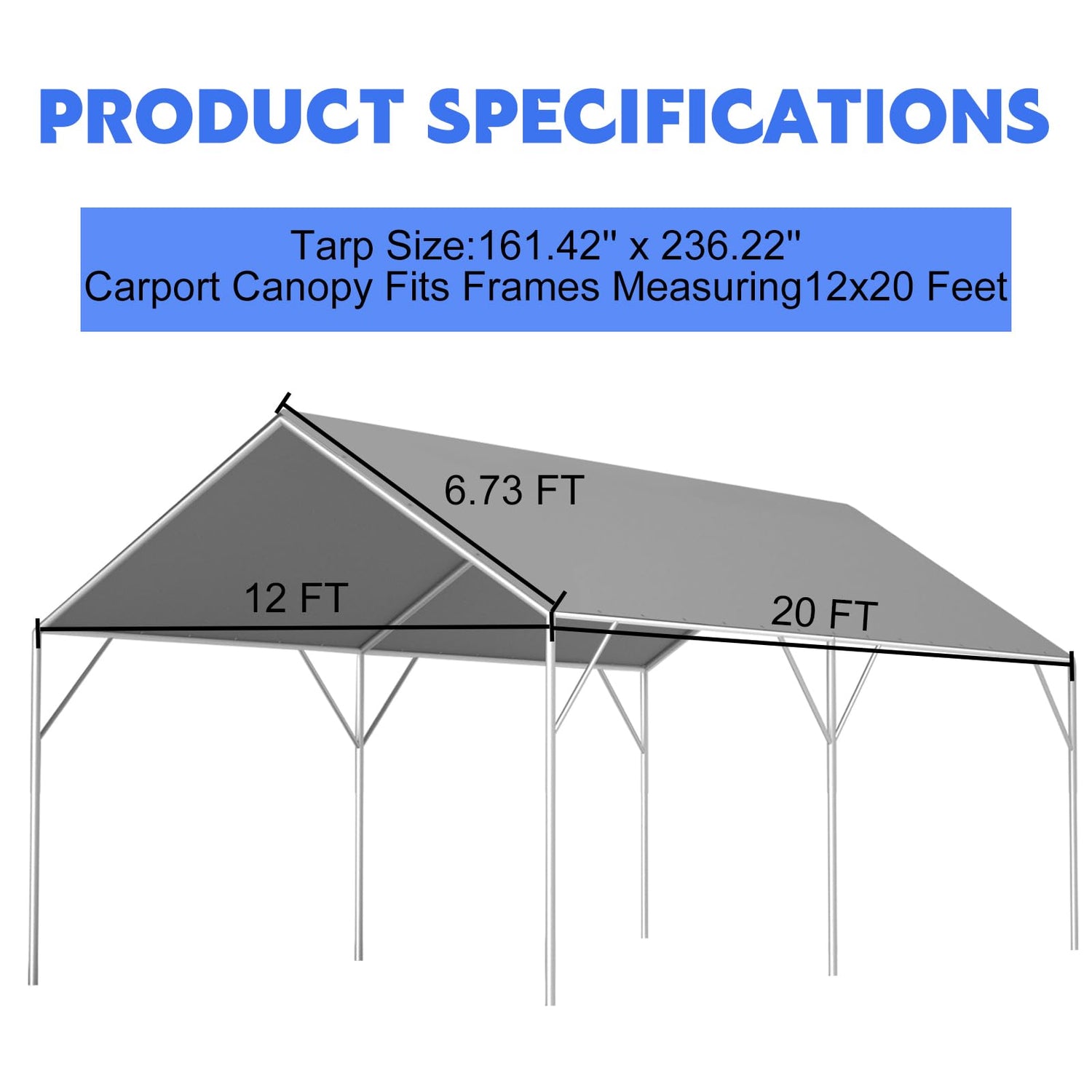- 【Wide Application】-Whether you have a carport, canopy, or tent, these replacement carport tarp cover are suitable for most types of frames in dimensions 12'W x 20'L. They are also suitable for use in different outdoor settings, such as in the backyard, at a campground, or a construction site.