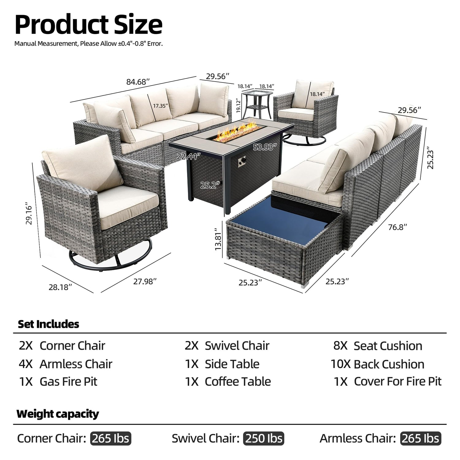CAODOC 11 Piece Outdoor Patio Furniture Set with 53" Fire Pit Table, Wicker Sectional Conversation Set Whit Swivel Chairs,Modern Outside Sofa for Balcony Backyard(Beige)