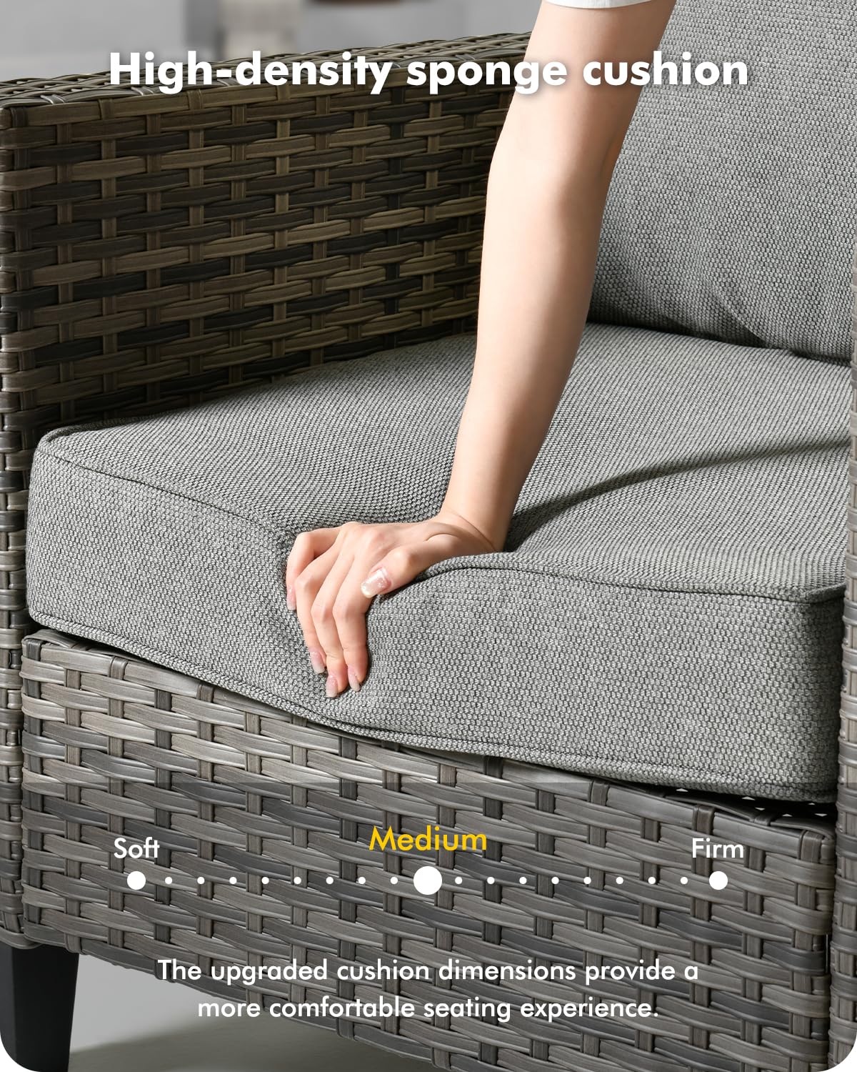 - Flexible and Multi-Functional Sectional Design: This set includes an ottoman that can be used in three ways: as a leg rest, a side table, or additional seating. The various arrangement options allow you to create a welcoming outdoor space suitable for lounging, hosting, or just enjoying the outdoors. This wicker conversation set is versatile, enabling you to configure it perfectly to fit your garden, balcony, deck, patio, porch, or yard.
