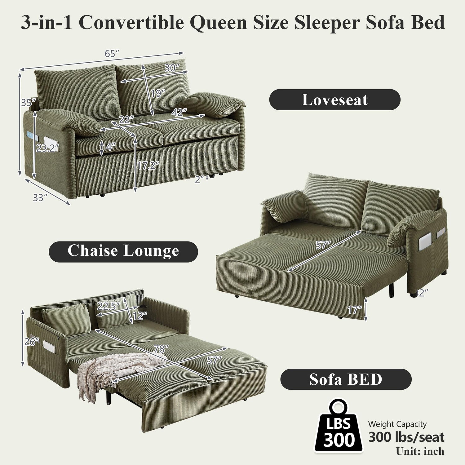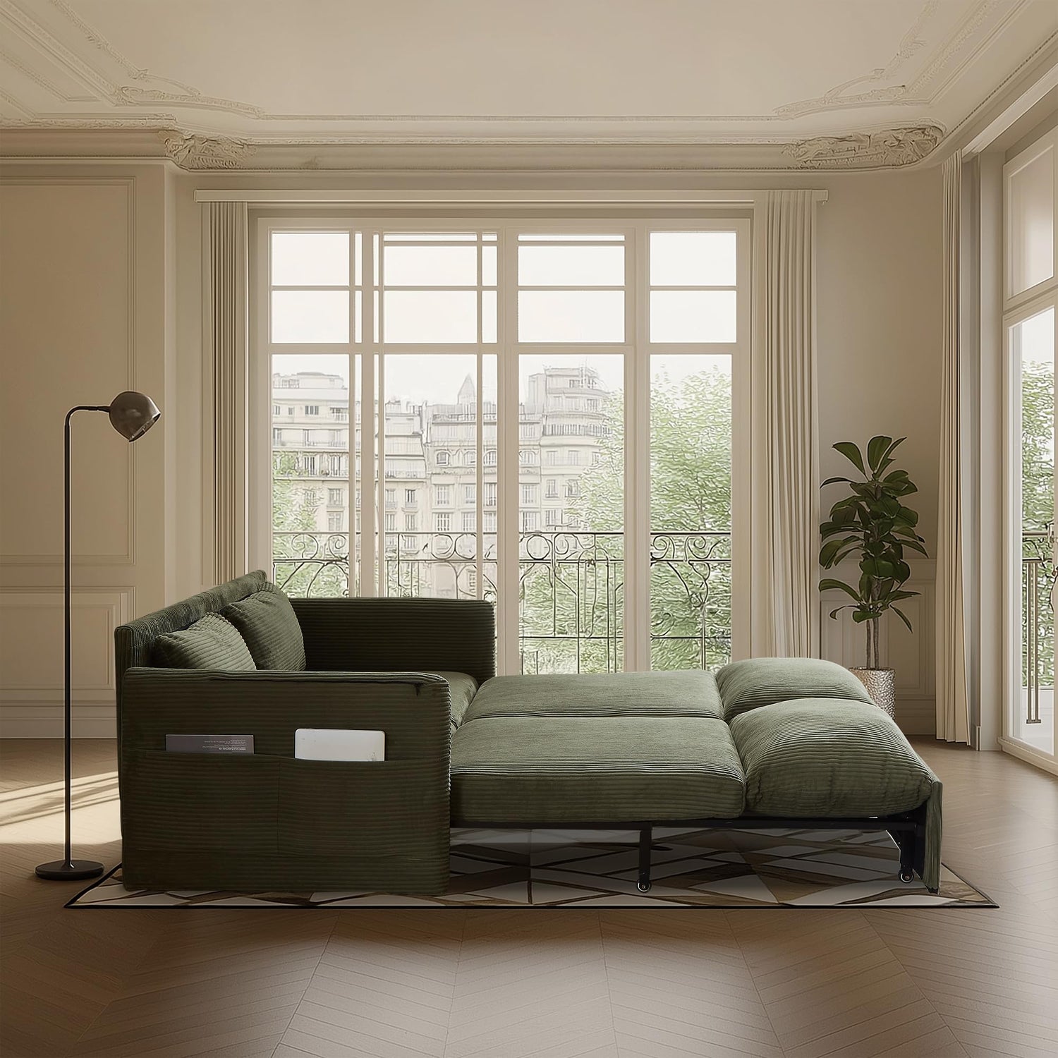 CAPCAEK Queen Size Pull Out Couch Sleeper Sofa Bed, 3-in-1 Convertible Futon Couch for Living Room with Storage Pockets & Arm Pillows, Modern Corduroy Sofa Bed(Green)