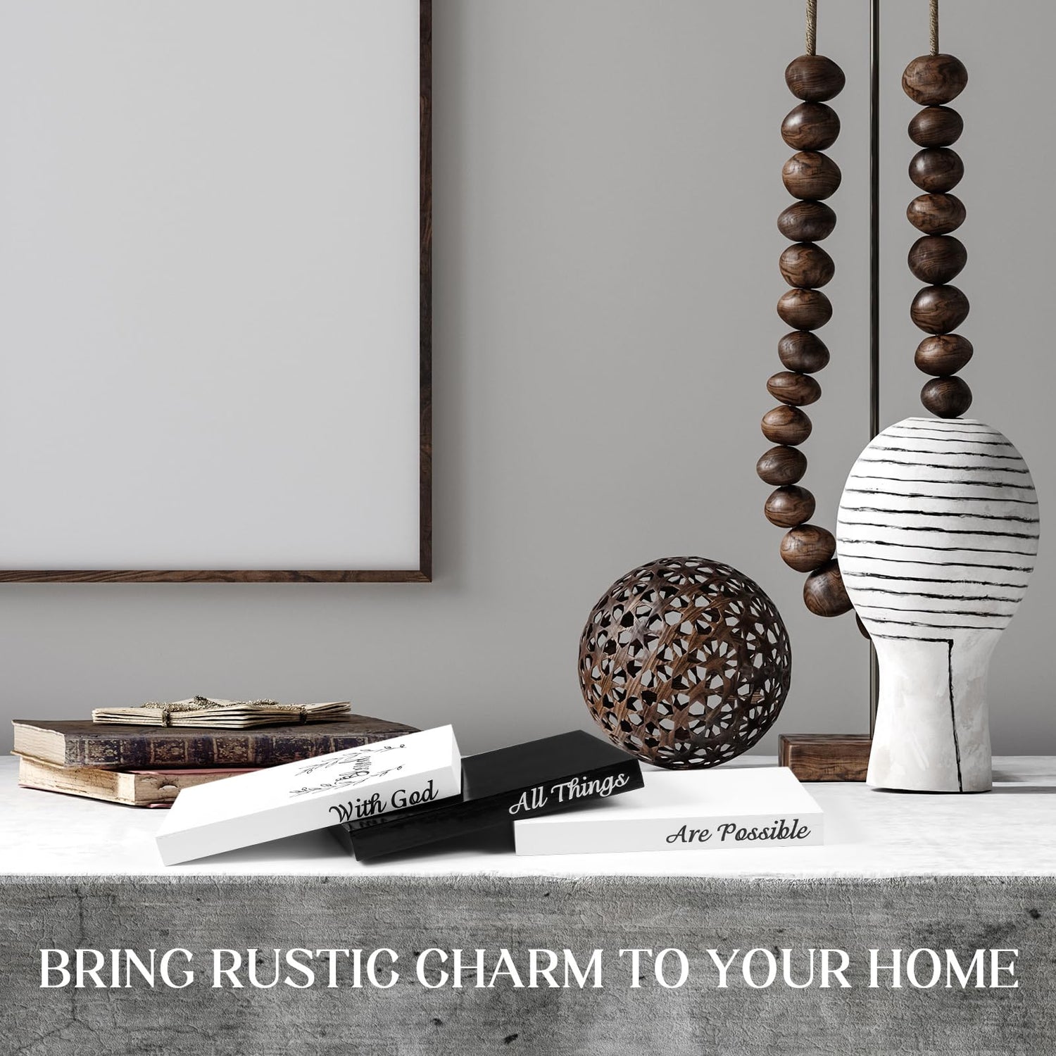 - What You Get: you will receive a decorative faux books set, it reads [with god], [all things], [are possible], 1 string of farmhouse beads with tassels, 1 piece black and white buffalo plaid ribbon, and 1 piece artificial leaf, suitable for a variety of home decoration