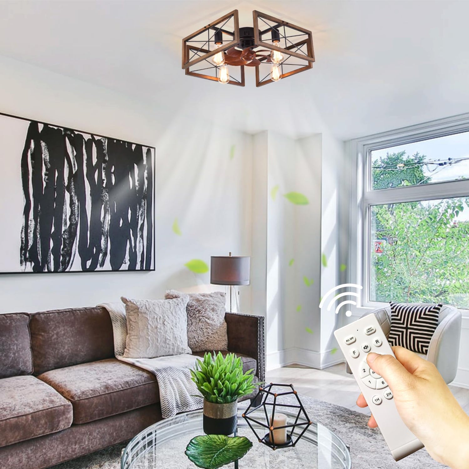 Capslpad 20''Farmhouse Flush Mount Ceiling Fan with Light and Remote Control,Industry Wood Low Profile Fan Rustic Industrial Caged Indoor Ceiling Fan for Bedroom Living Room Kitchen (4-Light)