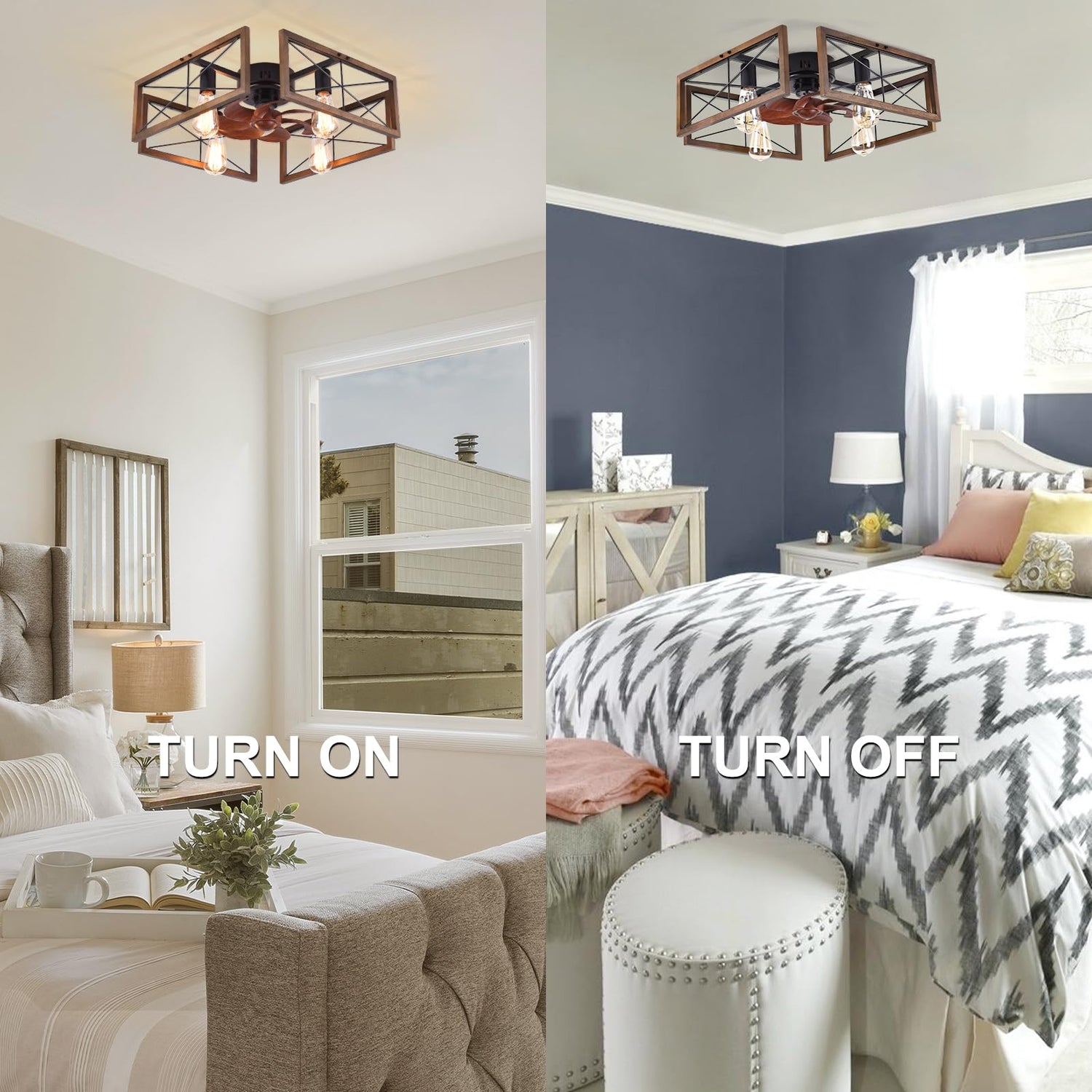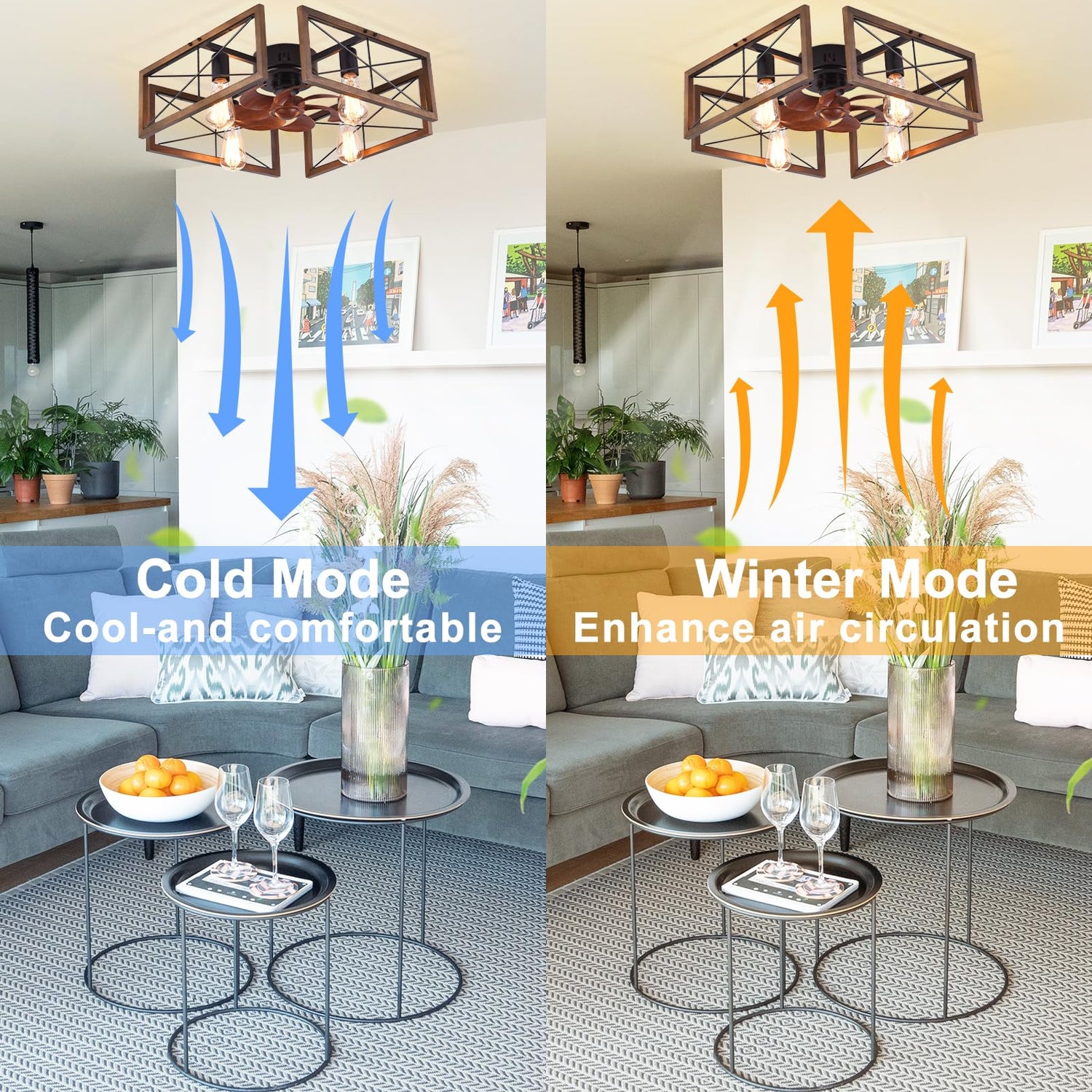 - 【Low Profile Ceiling Fans with Light】: 4-light farmhouse flush mount ceiling fan with light measures 20 .47inches diameter x 7.48 inches height and outer frame is made of original wood frame and black grid metal.