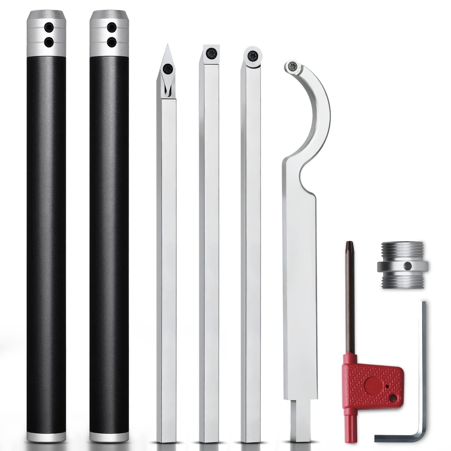 - 【Upgraded High-quality Turning Tools,handle And Connector Are Removable And Adjustable】High-density tungsten carbide cutting heads are made with high-speed steel blade material which will not wear off easily. 2*Aluminum alloy detachable handle and connector, can be replaced or disassembled freely, saving a lot of money(other turning tools only have 1 non-replaceable connector, damage will not work).Aluminum alloy handle is sandblasted and anodized by electroplating, better feel for processing.