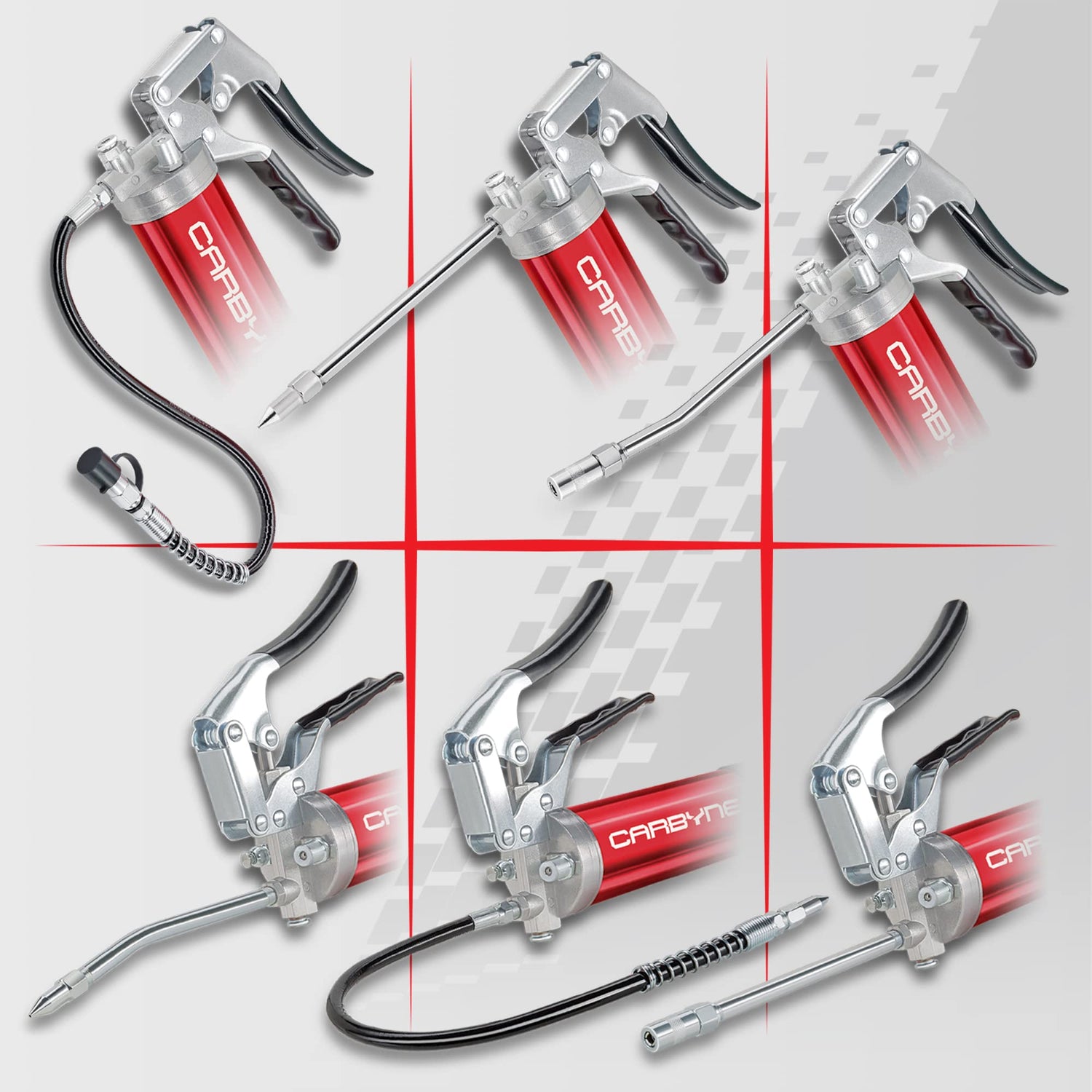 Carbyne Grease Gun - Pistol Grip, 7500 PSI, Heavy Duty Professional Quality, Anodized Aluminum Barrel. 18" HD Flex Hose w/Spring, 6" Straight & 6" Angled Tube, Coupler & Needle Noze, 3-Way Loading