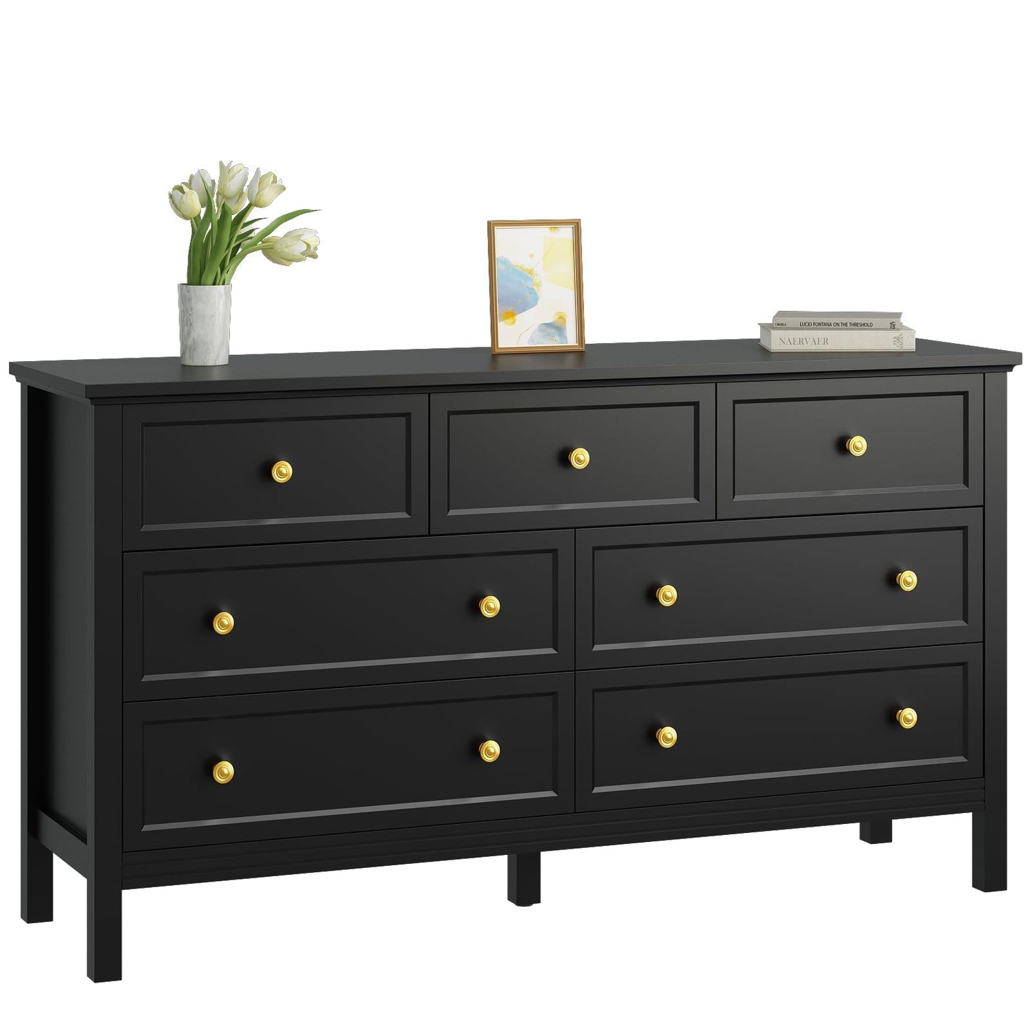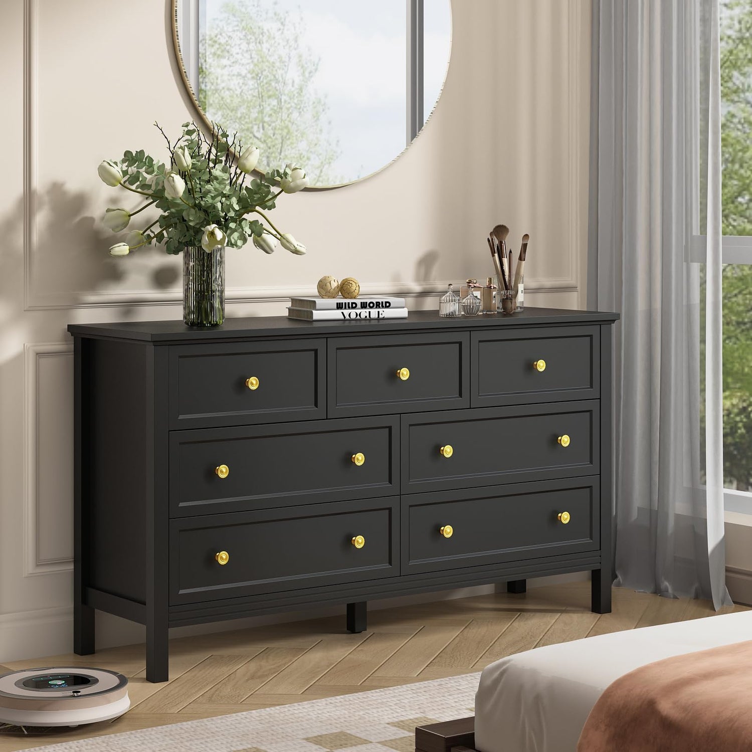 CARPETNAL Black Dresser for Bedroom, 7 Drawer Dresser with Wide Drawers and Gold Metal Handles, 55" Black and Gold Dresser TV Stand, Modern Dressers & Chests of Drawers for Hallyway, Entryway.